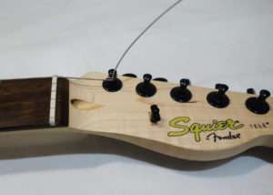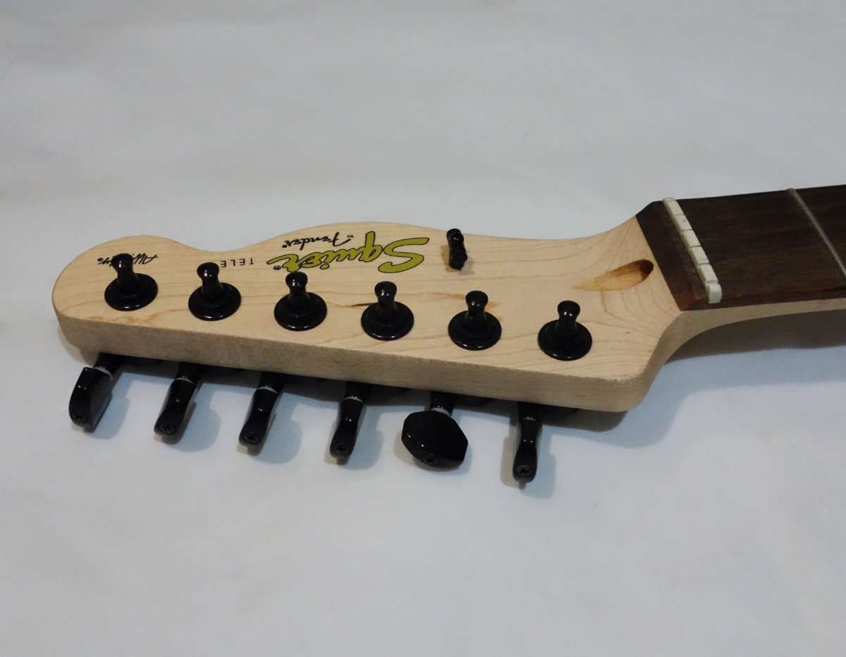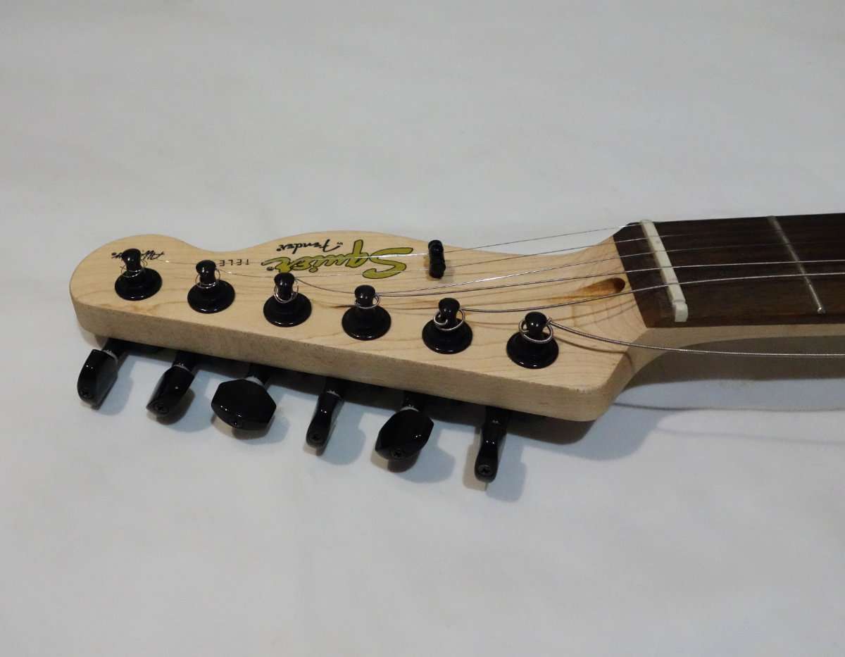 弦の交換ではカッターで切ってしまうとヘッド側もブリッジ側も弦をはずしやすいですが、新しい弦が不良品(アメリカ産なので結構あります)の場合に元に戻す事も考えて弦を取り外す事にします。スクワイヤーテレキャスターはブリッジに弦を通す表通しのため使用済みの弦でも貼り直しやすいです。