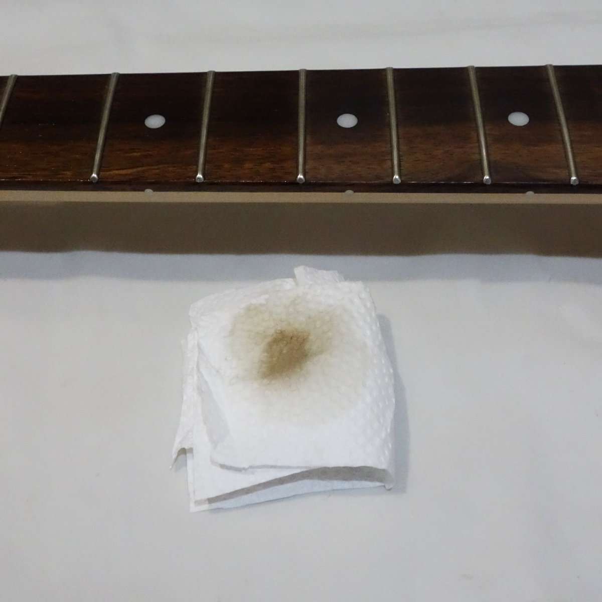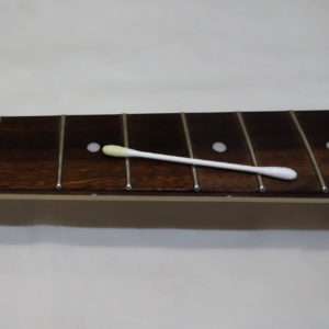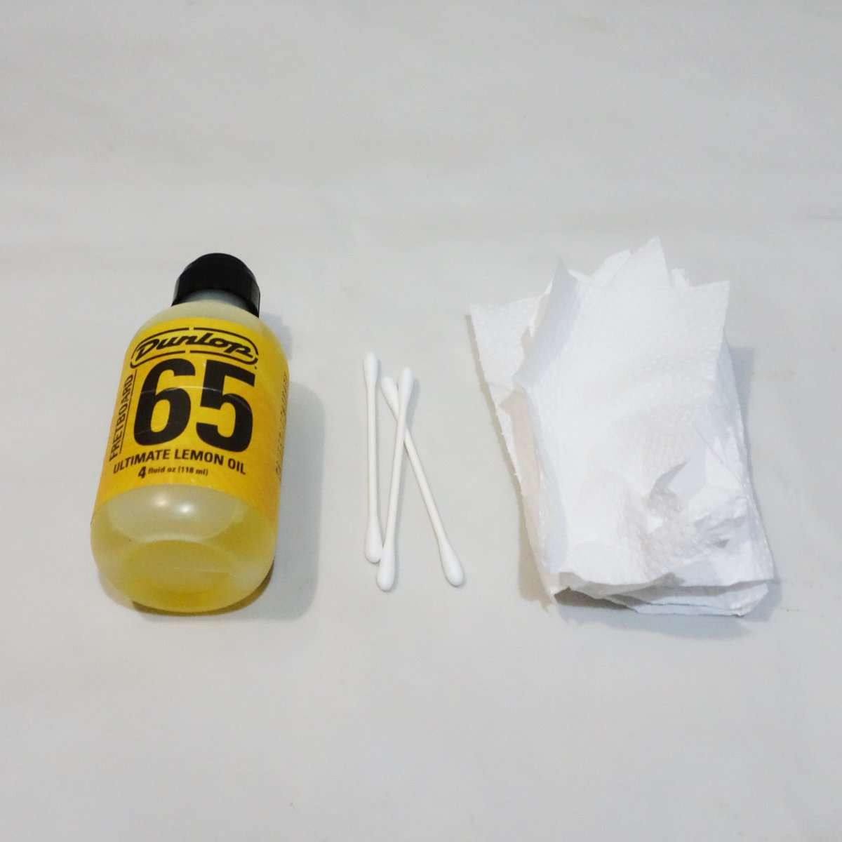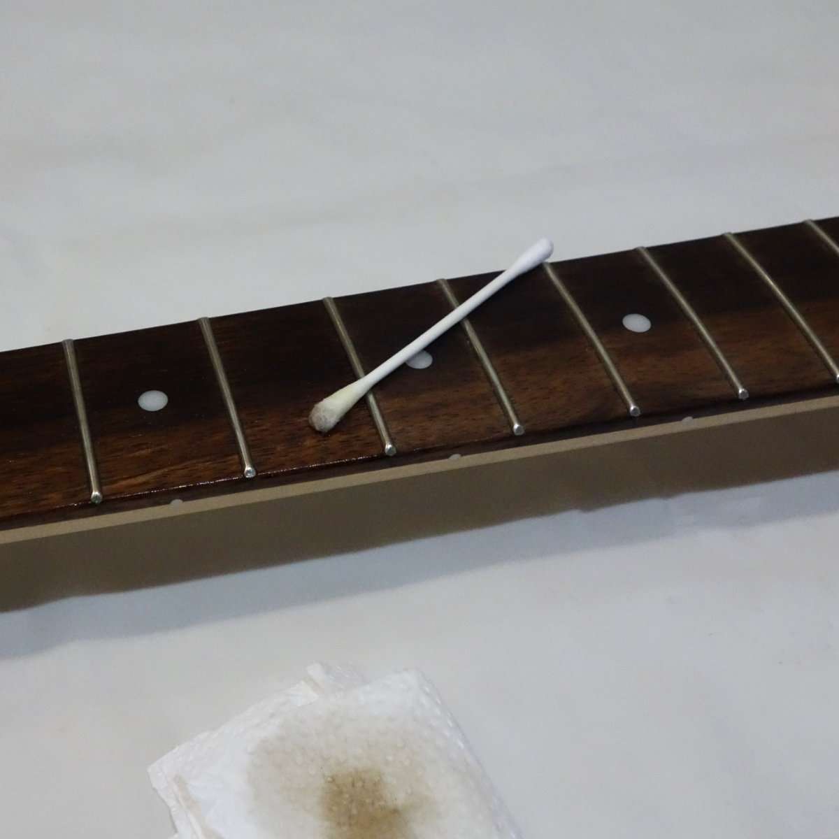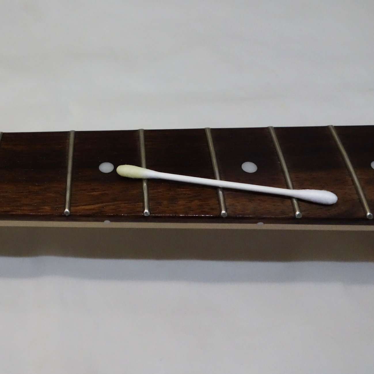 弦交換の時はギター全体がクリーニングしやすくなる絶好の機会なので、弦を外した状態で指板を綺麗にしてしまいます。指板はローズウッド(初期のみ)なのでクリーニングにジムダンロップのレモンオイルを使用します。コットンパフと綿棒を使うと清掃しやすいですが、手持ちがない場合はキッチンペーパーでも可能です。