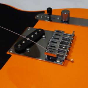 6弦から順番に張っていきますが、スクワイヤーテレキャスターは表通しでブリッジエンドから弦を通します。弦の先端を少し曲げてからブリッジを通すとサドルから弦が取り出しやすくなります。