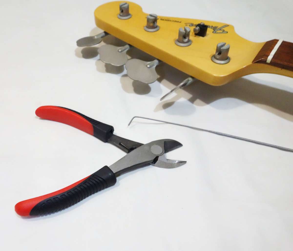 プレベの場合はペグのポストに弦を挿し込んでから巻きつけるタイプのため4弦であればブリッジから伸ばした状態で2〜3弦用のポストの間で先端を曲げます。弦の曲げた先を少し残して(ペグの後ろから出ない程度)弦を切り取ります。ベース弦は太く100均のニッパーなどだと刃がすぐこぼれるので専用のストリングカッターを使用しましょう。切り取った弦の先端はペットボトルなどに入れておいてまとまったら自治体のルールに合わせて廃棄するとよいでしょう。