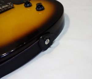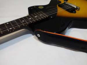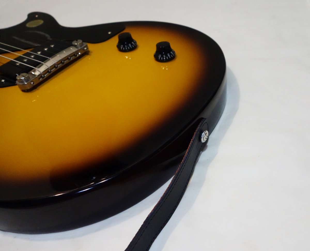 Gibson Les Paul Juniorのストラップピンは改造せずメーカーの出荷状態のままなので、ストラップをねじるようにストラップピンにはめこみます。ギターの重量とストラップのショルダーパッドの太さのバランスもよいので持ち重りせず非常に弾きやすいです。