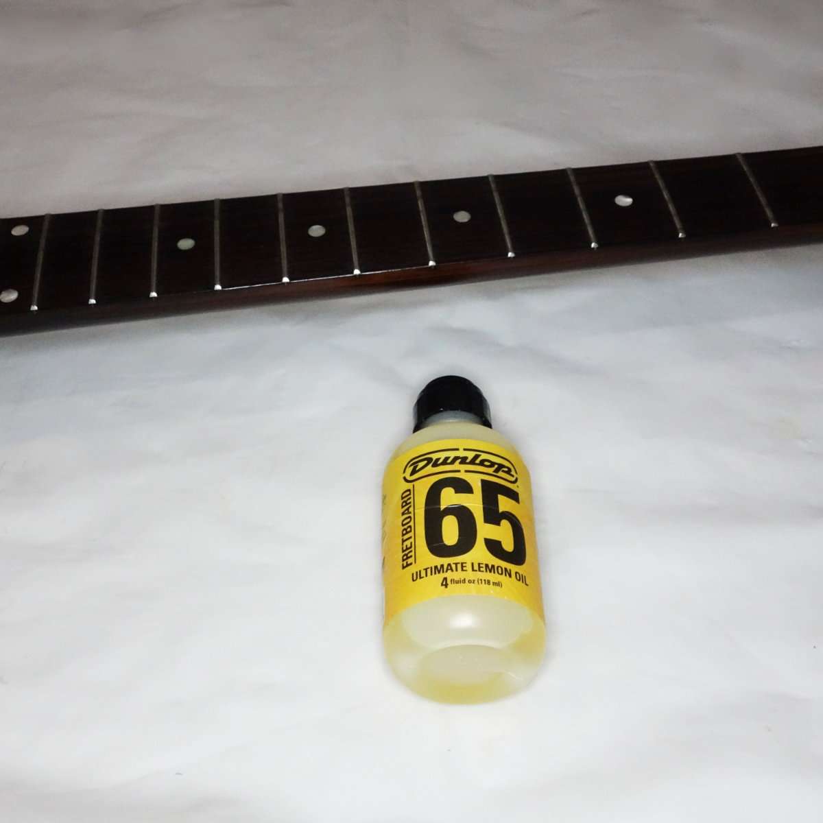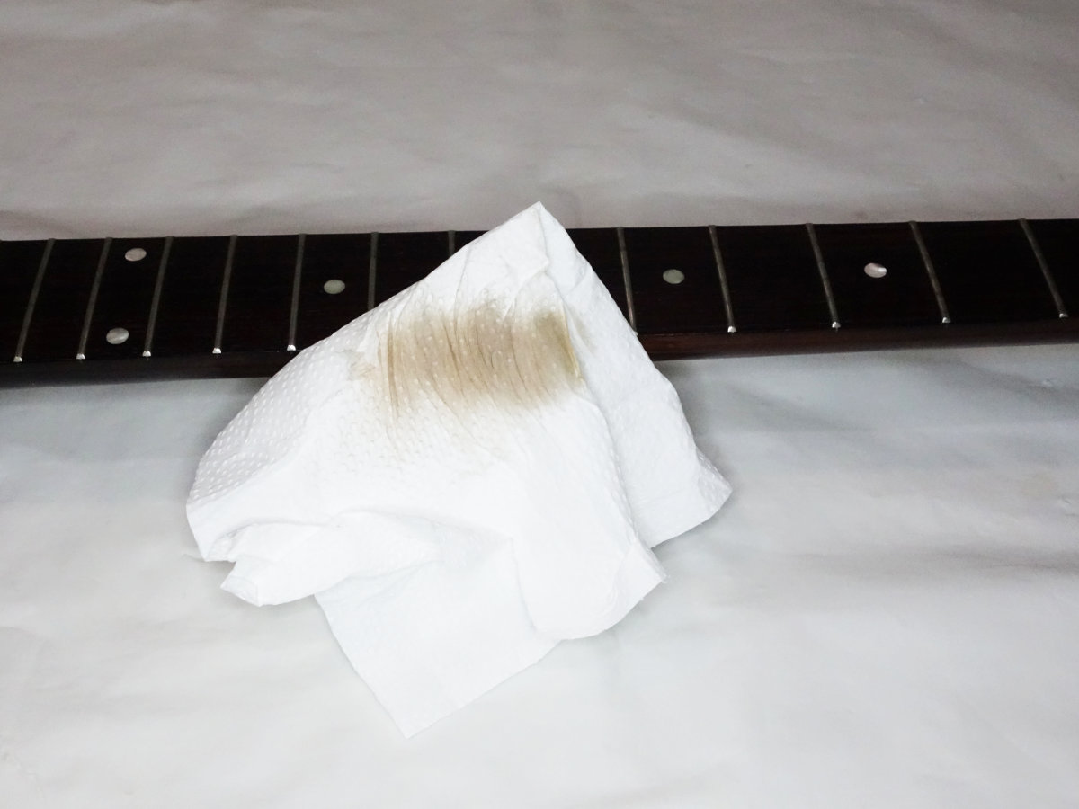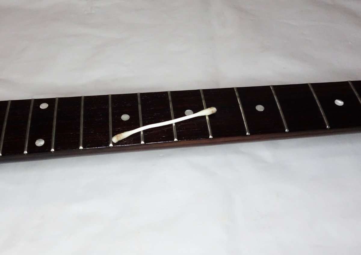 レスポールジュニアは指板がローズウッドなのでレモンオイルを使用してクリーニングと共に潤いを与えます。コットンパフ(なければキッチンペーパーなど)にレモンオイルを染み込ませて指板全体を拭き取ります。フレット横は細かくて磨ききれないので綿棒を使います。レモンオイルも塗りすぎは木材によくないので乾拭きをしてきちんと乾かします。