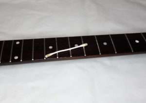 せっかく弦をはずしたのでナット側も弦の滑りをよくします。専用のナットグリスなどもありますが、他で使用しているミニ四駆用のシリコングリスなどで代用が出来ます。モリブデングリスはグリスがついてる部分が黒くなりグリスの度合いがわかりやすいのと乾きづらいので使いやすいです。シリコングリスは乾くとカスになるものもあるので水っぽいグリスの方が向いています。