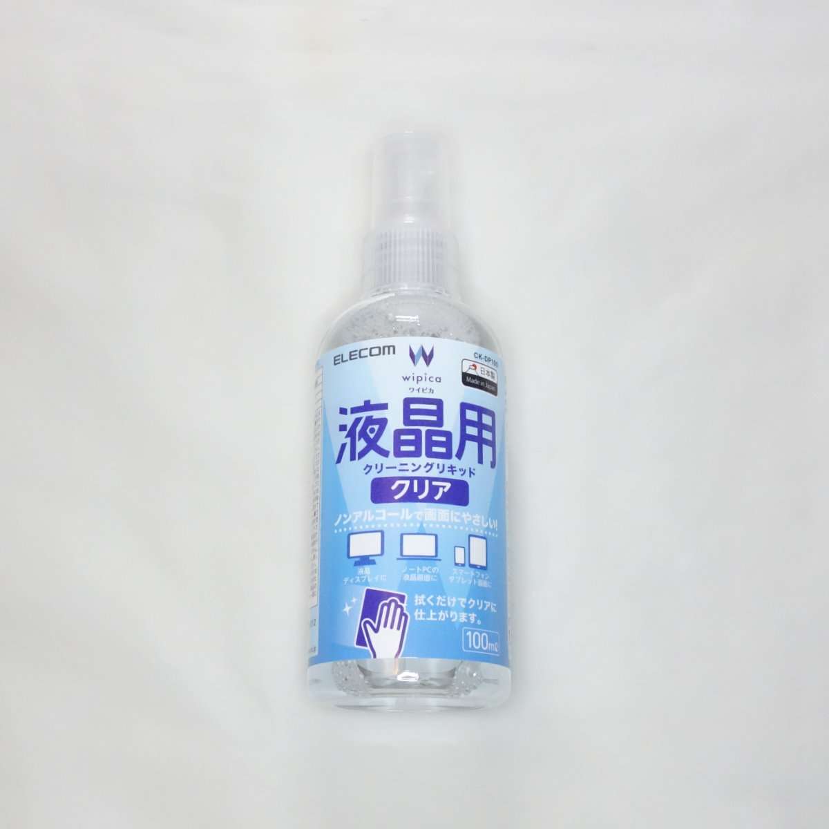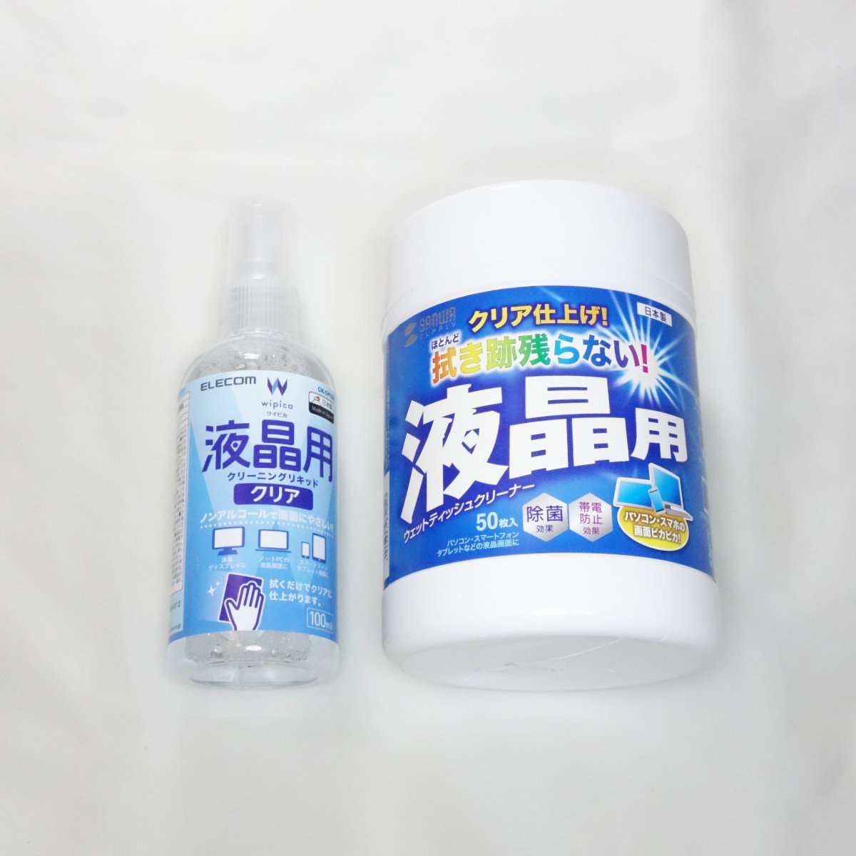 今回揃えたのはエレコムの液晶用クリーニングリキッドと拭き取り用ペーパーのキムワイプです。エレコムの液晶クリーナーはノンアルコールで幅広い液晶パネルに対応していて、キムワイプは毛羽立ちが少ないエンジニア向けペーパーです。