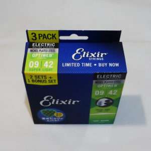 Fender Player Duo-SonicにエリクサーOptiwebを張ると以前のNanowebのヌルヌルした手触りと違いコーティングされているのがわからないほどに巻き弦はザラついていてプレーン弦はまさに通常の弦です。音質はメーカーが言うようにクリスピーでNanowebのようにこもり気味になる事もありません。他の弦よりテンションが強めのエリクサーですが、010から009にゲージを下げて細くしたのもありより押弦とベンドが楽にとても弾きやすくなりました。テンションがゆるくなったと言っても普通に弾ける範囲内で、指への負担も減るので気楽に弾きたい方にはおすすめのゲージです。もちろんコーティング弦と言えばのエリクサーなのでびっくりするくらいに錆びずに長持ちします。