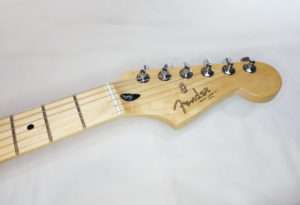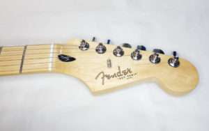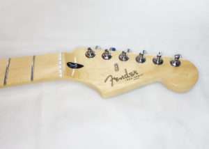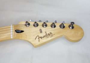 ボディとネックを磨いたら弦を張り替えます。Fender Player Duo-Soniは弦をボディ裏からの裏通しする方法でテンションを稼いでいます。出荷時はGibsonなどのミディアムスケールのギターと同様の010-046のゲージの弦を使用していますが、009-042のより細いゲージでテンションを緩めにします。この後より弦の交換が楽になるようにFender製ロッキングチューナー(ロックペグ)に交換しました。