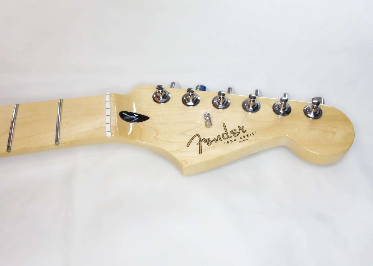 ボディとネックを磨いたら弦を張り替えます。Fender Player Duo-Soniは弦をボディ裏からの裏通しする方法でテンションを稼いでいます。出荷時はGibsonなどのミディアムスケールのギターと同様の010-046のゲージの弦を使用していますが、009-042のより細いゲージでテンションを緩めにします。この後より弦の交換が楽になるようにFender製ロッキングチューナー(ロックペグ)に交換しました。