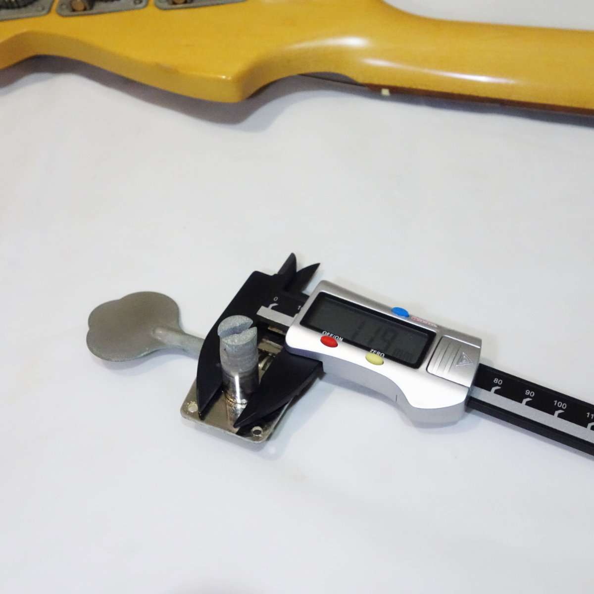 取り外したペグがスクワイヤージャズベースに取り付けられるかペグポストの経を測定してみます。Fender Japanのペグポストが11.8mm(12mm用)ですが、スクワイヤージャズベースの方は13.5mmでスリーブを入れ替えるか他のペグを使用する必要があります。