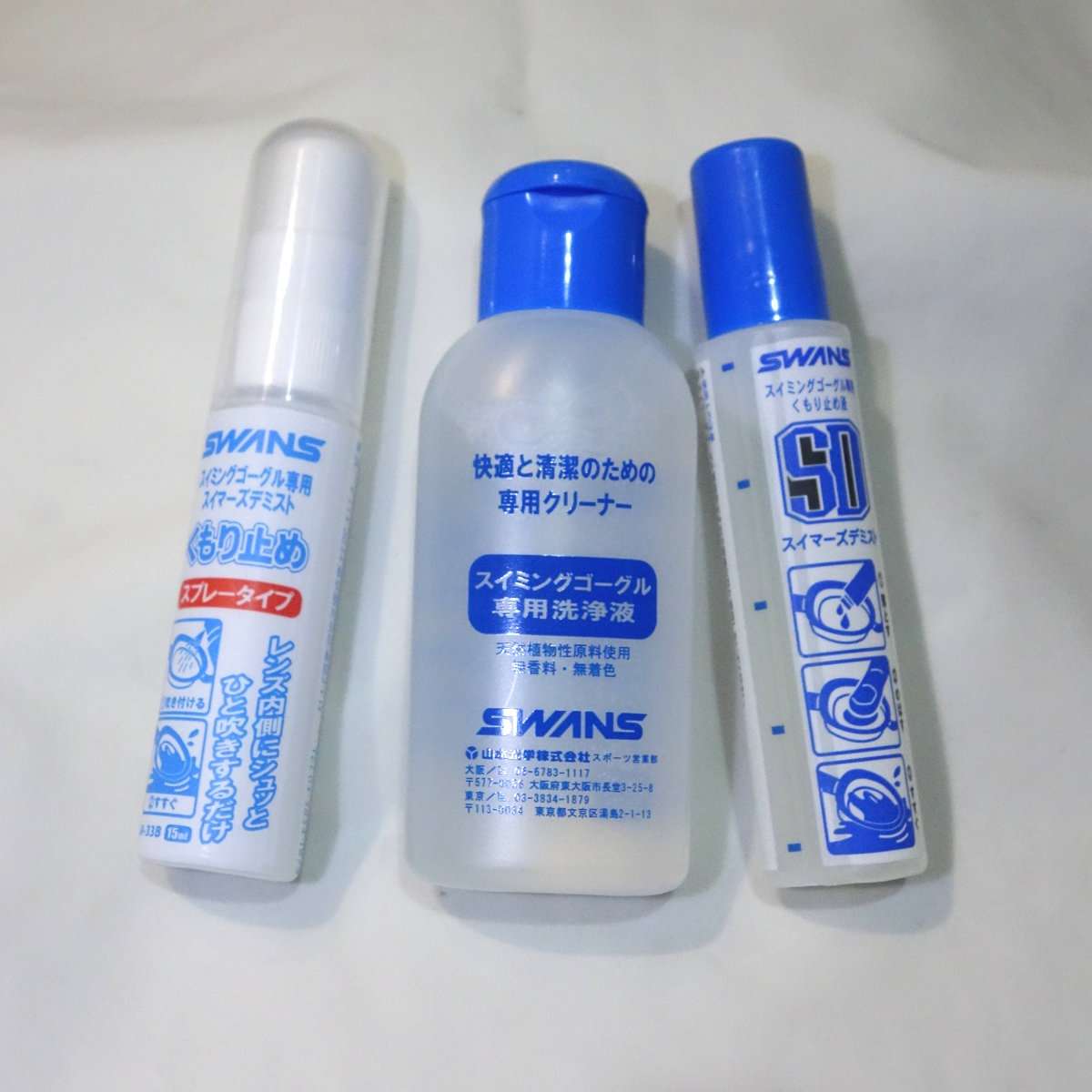 左からSWANSの曇りどめスプレータイプSA-33B、専用洗浄液SA-35、曇りどめスティックタイプSA-30B
