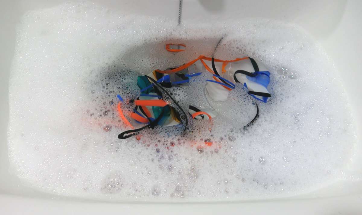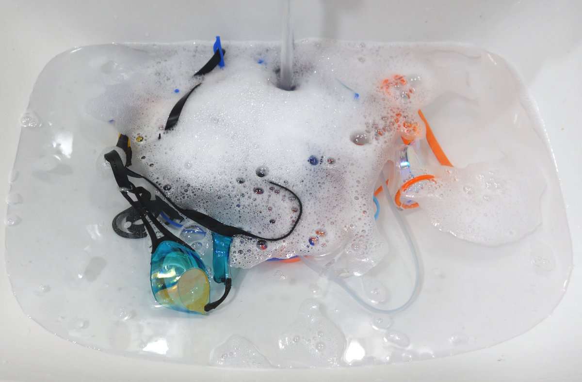 水に洗浄液を薄めてゴーグルを洗いそのままつけておきます。ゴーグルは1つずつ洗った方が傷がつきにくいです。