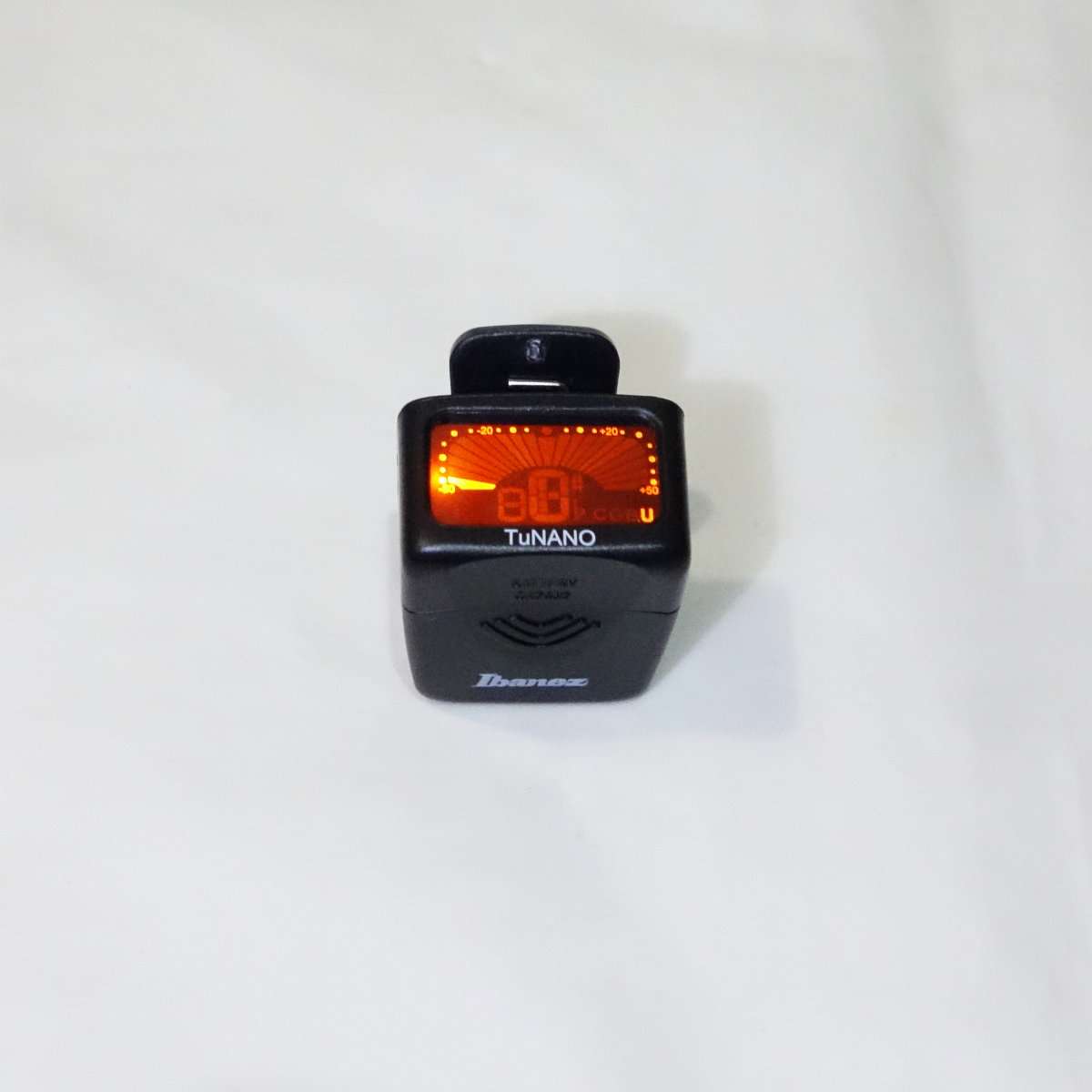 スイッチを入れてIbanez TuNANOでチューニングをしてみると他のクリップチューナーよりも音への反応がとても速いです。他のクリップチューナーだと弦を弾いても反応が鈍い時がありますが、Ibanez TuNANOは音を見失う事がなく騒音にも強くすぐにチューニングが終了します。細かく合わせると言う意味ではTC Electronicのストロボチューナーなどのようにはいきませんが、急いでチューニングを合わせてすぐ演奏する場合はこのIbanez TuNANOに勝てる機器はなかなかないと思います。家でちょっと弾くだけの時などにも最適です。現在はTC ElectronicのポリフォニックチューナーPolyTuneとIbanez TuNanoを使い分けています。