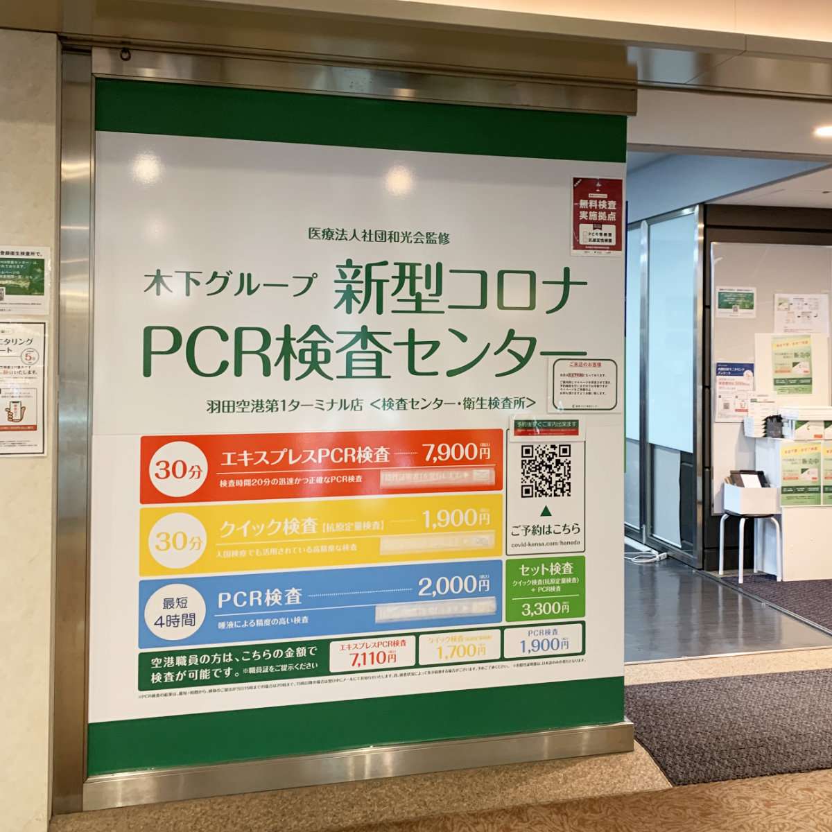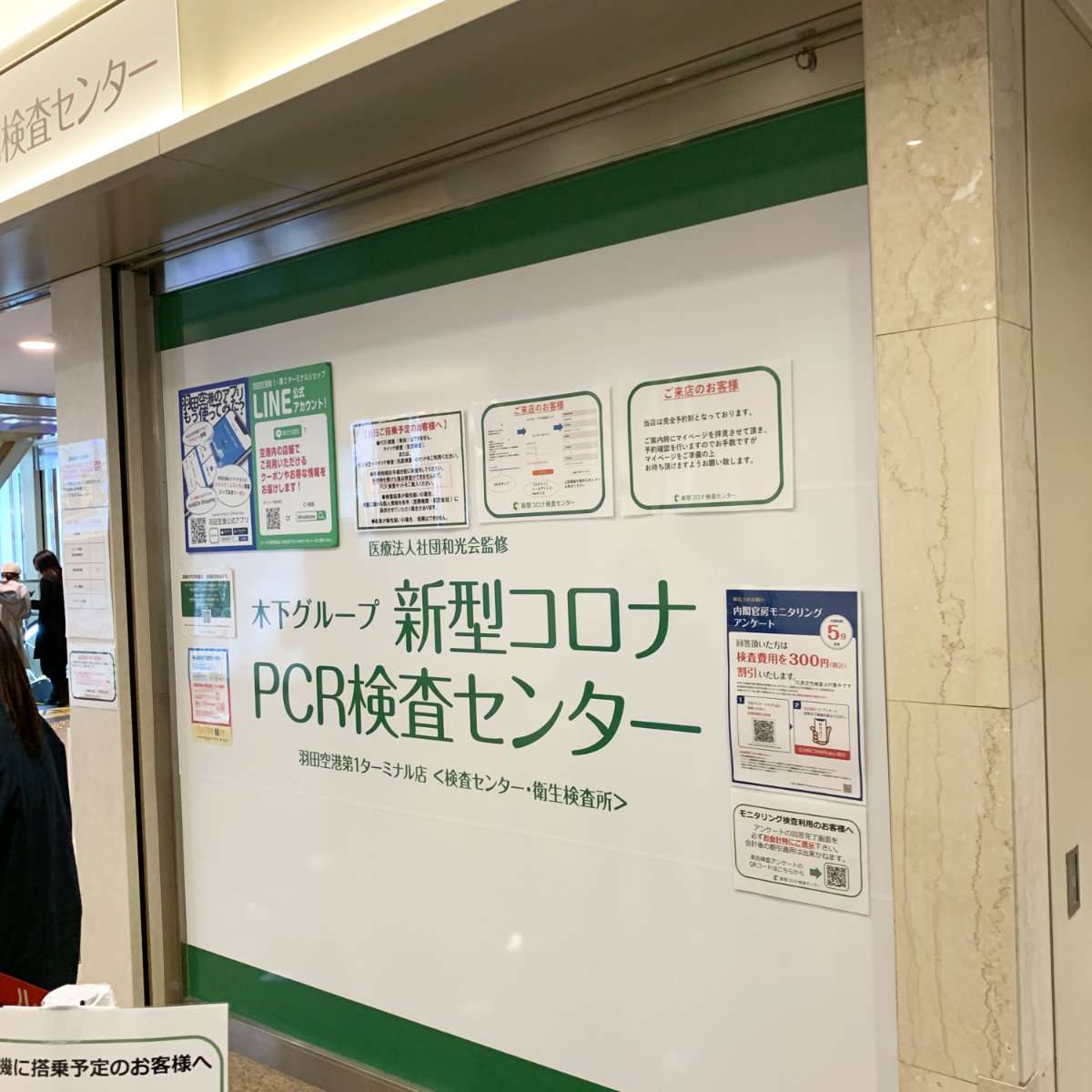 街で見かけた事があるかもしれないかなり広域でかつ格安でPCR検査をしている木下グループです。通常のテストであれば近所にあるところでもよかったのですが、街にあるのは結果が出るのは翌日で、海外へ行く場合の陰性証明が前日以内に受けた分でないと許可されない(以前は3日だった)ため、前日に検査を受けてその当日に結果がもらえる場所と言う事で羽田空港の支店を選びました。検査には事前の予約が必要で期日が近くなると予約締め切りの時間帯が多くなるので、早めに予約を済ませておきましょう。