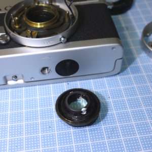 せっかくレンズをすぐはずせるところまで到達しているので、ついでにレンズもクリーニングする事にしました。C35系はレンズをはずすとフォーカス(ピント)の調整が必要となるので、レンズが綺麗な場合はそのままにしておきましょう。フォーカス調整はCdSがついていたリングがはずれたままの方が楽なので、レンズをクリーニングする場合はフォーカス調整を先に済ませた方がよいでしょう。レンズのクリーニングとカビ取りにはフジフィルムのレンズクリーニングペーパーとリキッドを使用するとレンズが綺麗になるだけでなく多くのカビを取ることが出来ます。