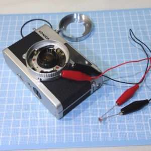 いきなり半田で取り付けて動かないとこまるので、手に入れたワニ口クリップを利用してカメラの露出計が動くかを確認します。CdSに極性はないのでプラスマイナスのどちらに付けるかの方向性はありません。新しいCdSをつないでみると露出計が動きだしました。もう1台のC35フラッシュマチックと同等の値を指すので特性も問題ないようです。