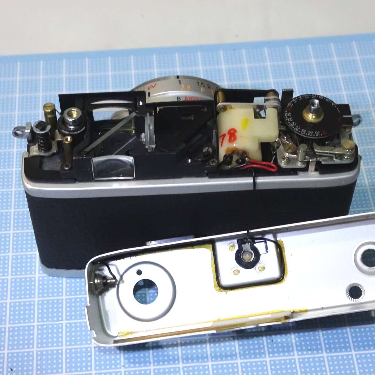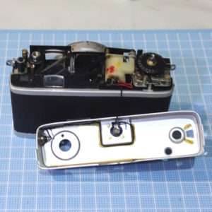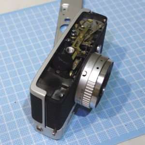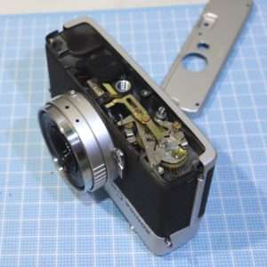 これでC35が動く事がわかったので、完全に撮影出来るように他の部分のクリーニングなども済ませてしまいます。このC35はセルフタイマーの動きがよくなくバルブも効かなかったのでその修理と調整も必要です。C35系は底部から見える真鍮の大きなフライホイールでシャッタースピードを制御してて、ここが古いオイルやグリスで固着する事によって動かなくなります。大体の場合はベンジンなどで洗浄すると直ってしまいます。
