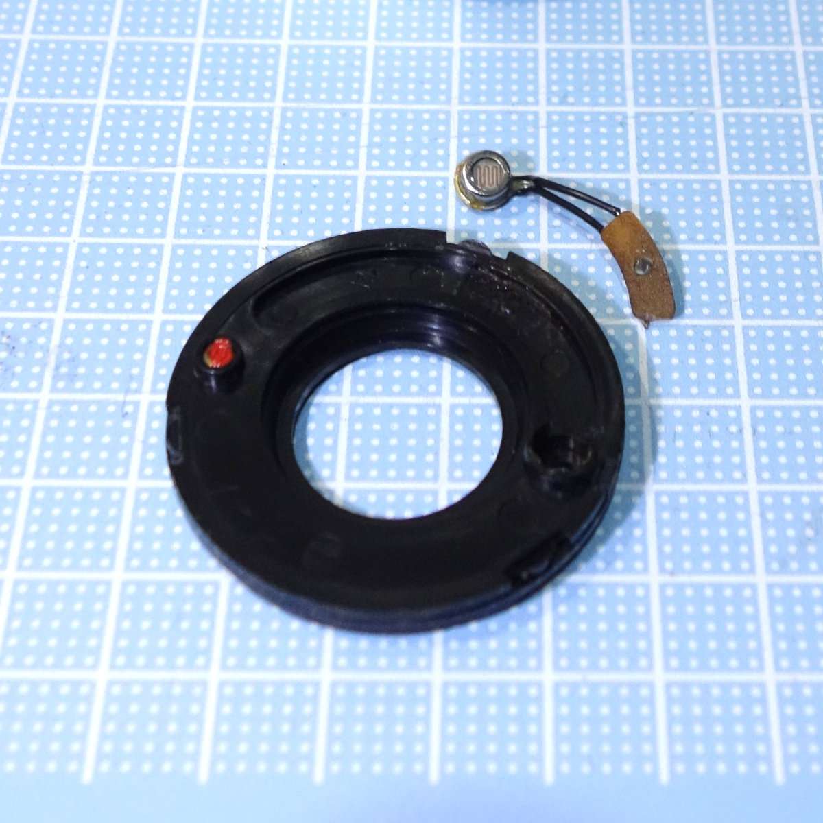レンズ名が書いてある黒いリングにCdSが貼り付けられています。CdSの配線からつながるのは小さいですが基盤で、これもはずした方が半田づけが楽になります。この基盤がある事でCdSが固定されフォーカスのリングがまわってもCdSが動かず、配線自体の断線も防いでいるようです。
