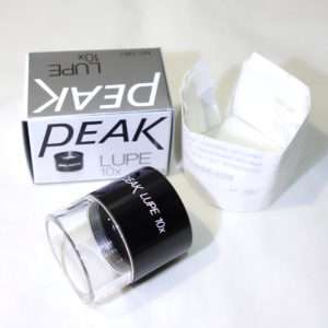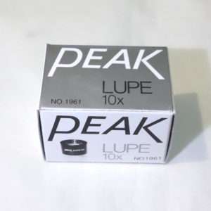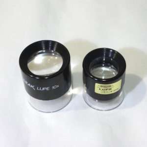 ちょうど手持ちであったフィルムチェック用の10倍のルーペと比べてみます。同じ10倍の倍率ですがかないり大きさが違います。大きい方は定規がついていましたが、邪魔なのではずしてあります。画質自体もピークのルーペの方が明るく見やすいです。