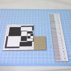 無限大は屋外を見る事で合わせられますが、近くのフォーカスを合わせるためにフォーカス調整キットを用意します。これはデジカメなどのオートフォーカスの精度を測るために使用するもので、製品を用意すると値がはるのでここでも自作します。ネットをさがすとプリント用の画像が見つかるので、それをプリントしてダンボールに貼り付けます。実際は35mmフィルムサイズですと点光源の方がみやすいので、このフォーカス調整キット作成は余裕があれば程度で大丈夫です。
