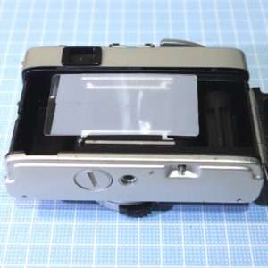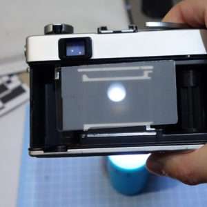 作成は非常に簡単で透明な板にメンディングテープを貼り適切な大きさに切り取るだけです。35mmフィルム用であれば縦をフィルムサイズにして横を長めにしておけば様々なカメラで使いまわせるようになります。この時にフィルムが乗るレール部分に乗る幅に作る事が重要です。ここではKonica C35 Flashmatic(C35フラッシュマチック)の前期型を使用してフォーカス調整をすすめます。