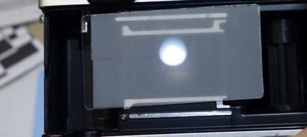 フォーカシングスクリーンには明るい被写体の方がわかりやすく映りますので、ライトなど点光源を映すと近距離でのフォーカス調整はしやすくなります。カメラの基本ですがフィルムに写る画像は上下左右が逆になります。自作フォーカシングスクリーンの裏表はメンディングテープを貼った面をレンズ側にします。