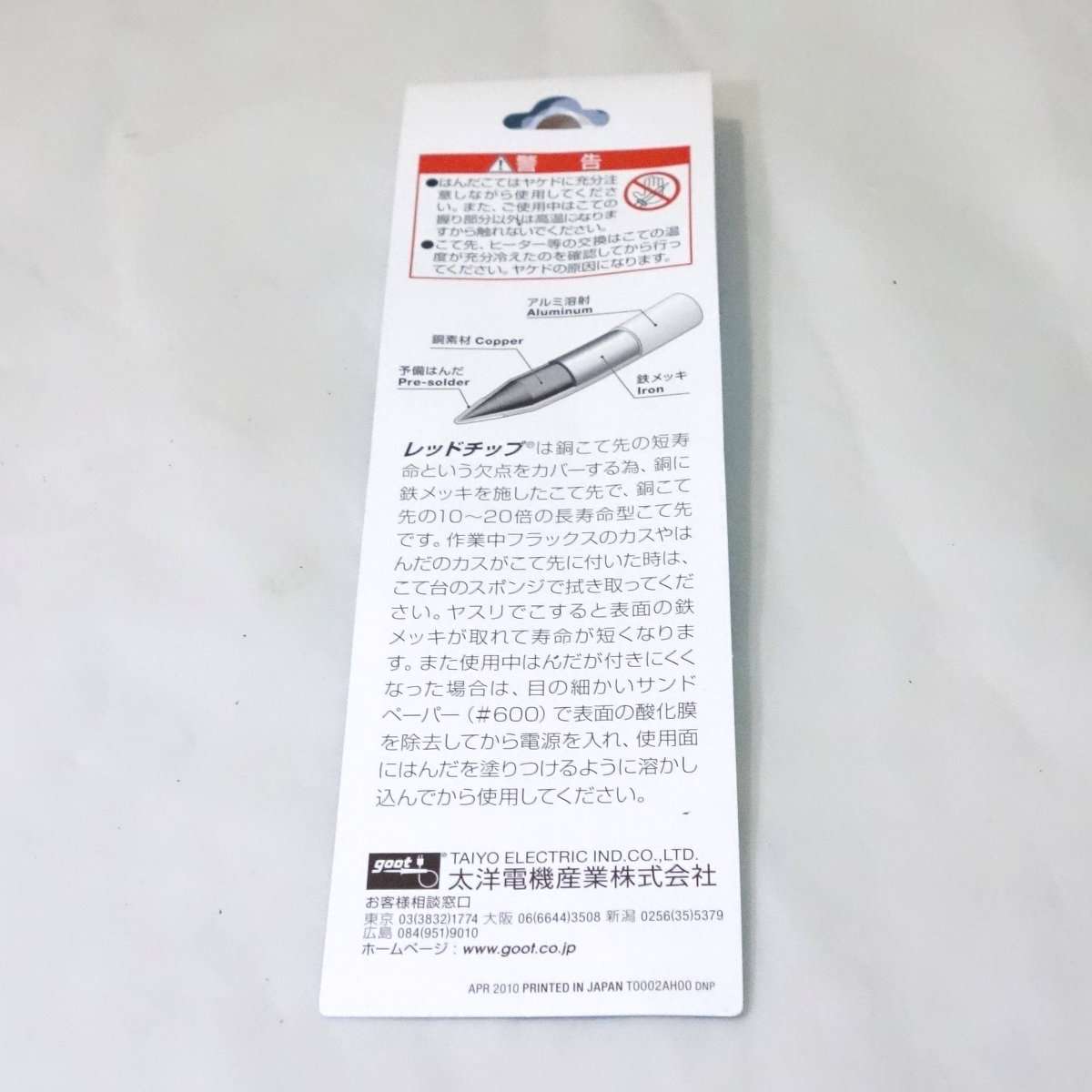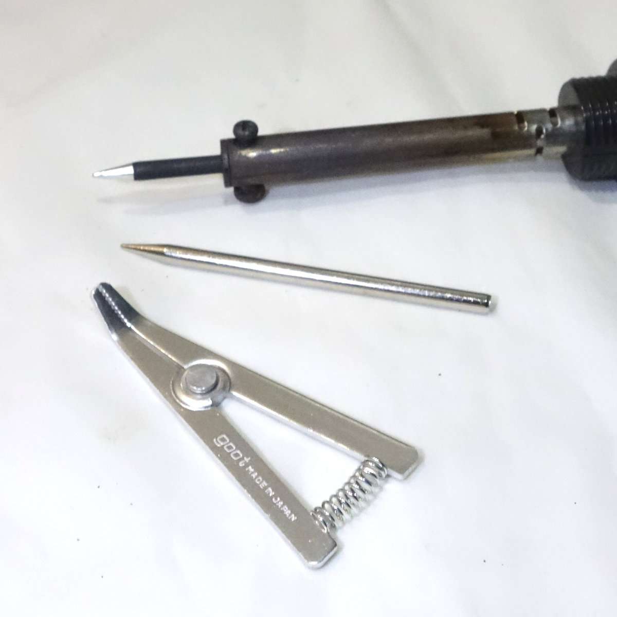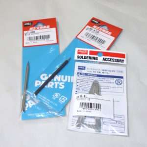 半田ごての小手先には様々な種類があります。半田ごてによってサイズは違いますが、今回は径4mmの長さ75mmの物にしました。電子工作工具の大手であるgoot(太陽電気産業)の商品でシンプルな金属の方(型番T-48B)をレザークラフトのワックス専用にし、根元が黒く処理されている方(型番RB-475B)を通常の半田付け専用にしました。ちょうどよかったので同時にヒートクリップも手に入れました。gootの製品は半田ごて以外の工具も使いやすくホットボンド(ホットメルト)なども使用しています。