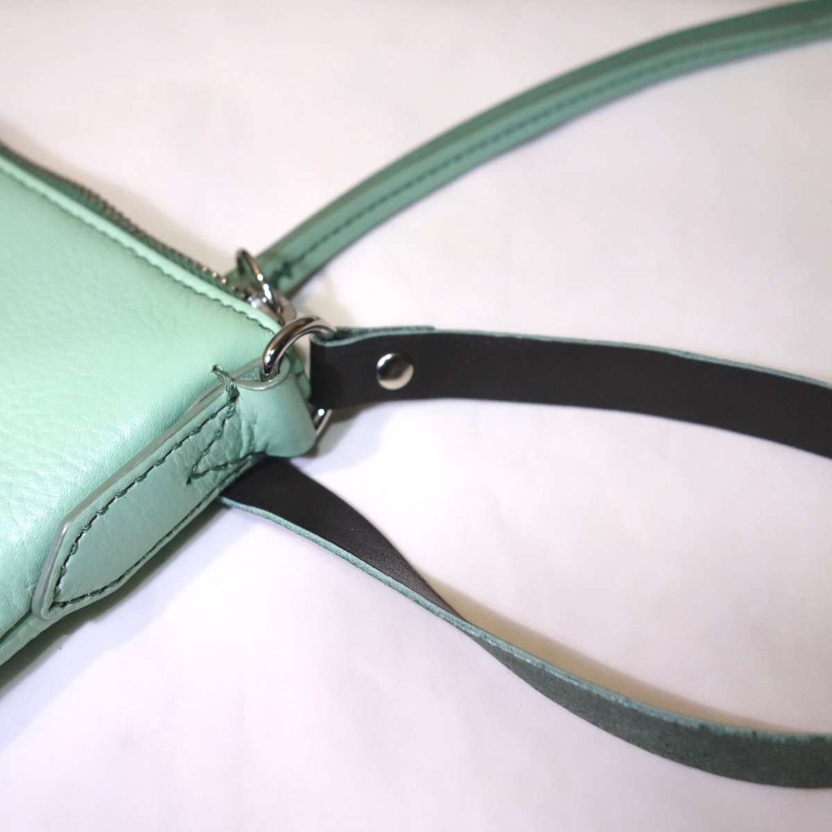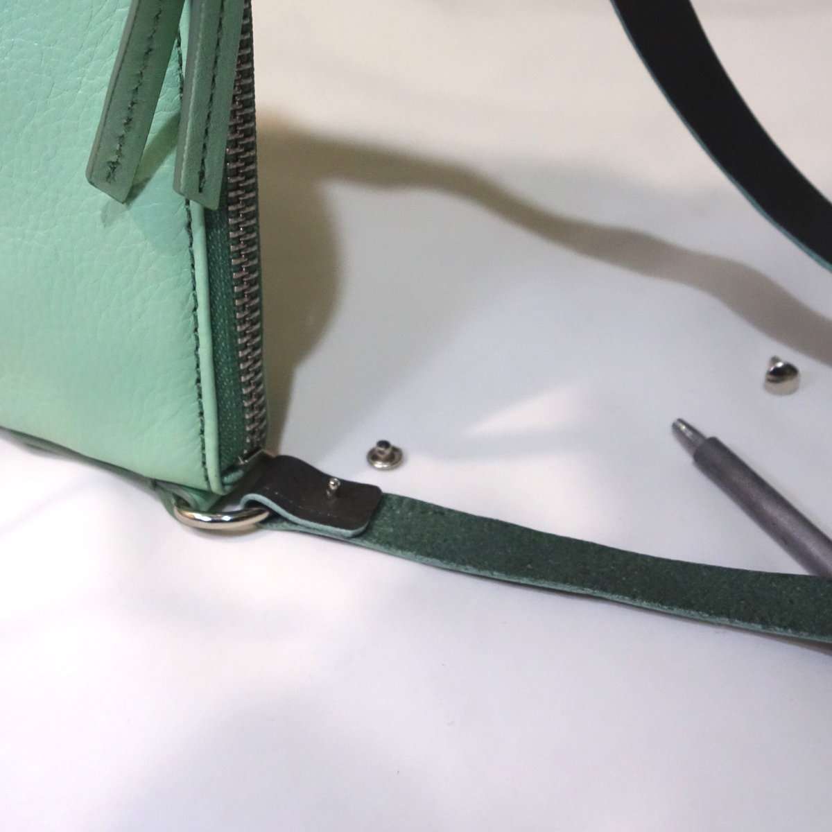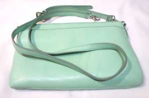 今回ストラップを交換するのはエメラルドグリーンの革のハンドバッグです。ストラップはかなりの長さに伸ばせるのですが、普段使う長さにするとストラップが2重になるくらいで金具も含めてかなり重量があります。これを長さをカスタムしたストラップを調整用の金具無しで取り付けて軽量化出来るようにします。