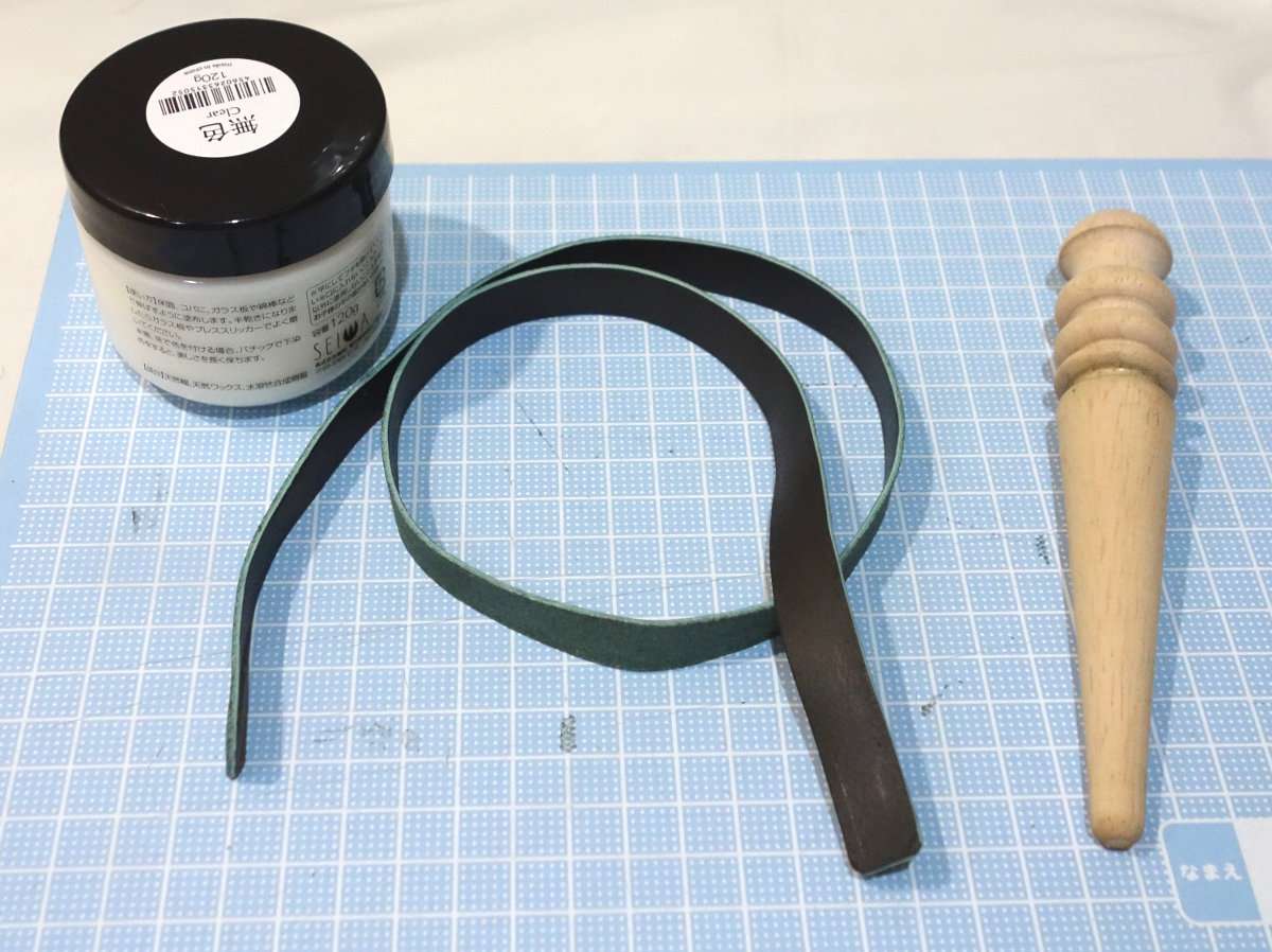 革の裏面(トコ)と端の切断面(コバ)の仕上げ処理をします。新聞紙などをひき革の裏面(トコ)にトコノールをヘラなどで薄く塗り乾く前にガラス板やコップなどで伸ばします。今回は短い物なので片側を伸ばしている間にトコノールが乾いてしまう事もないので全体を一度に済ませてしまいます。この時一方方向にガラス板などを滑らせましょう。側面(コバ)はスリッカー(コーンスリッカー)と言われる木を削った棒状の道具を使用します。これもトコノールを塗ってスリッカーで擦ります。これを2〜3度繰り返すと毛羽立ちなどがなくなり革の状態が安定します。