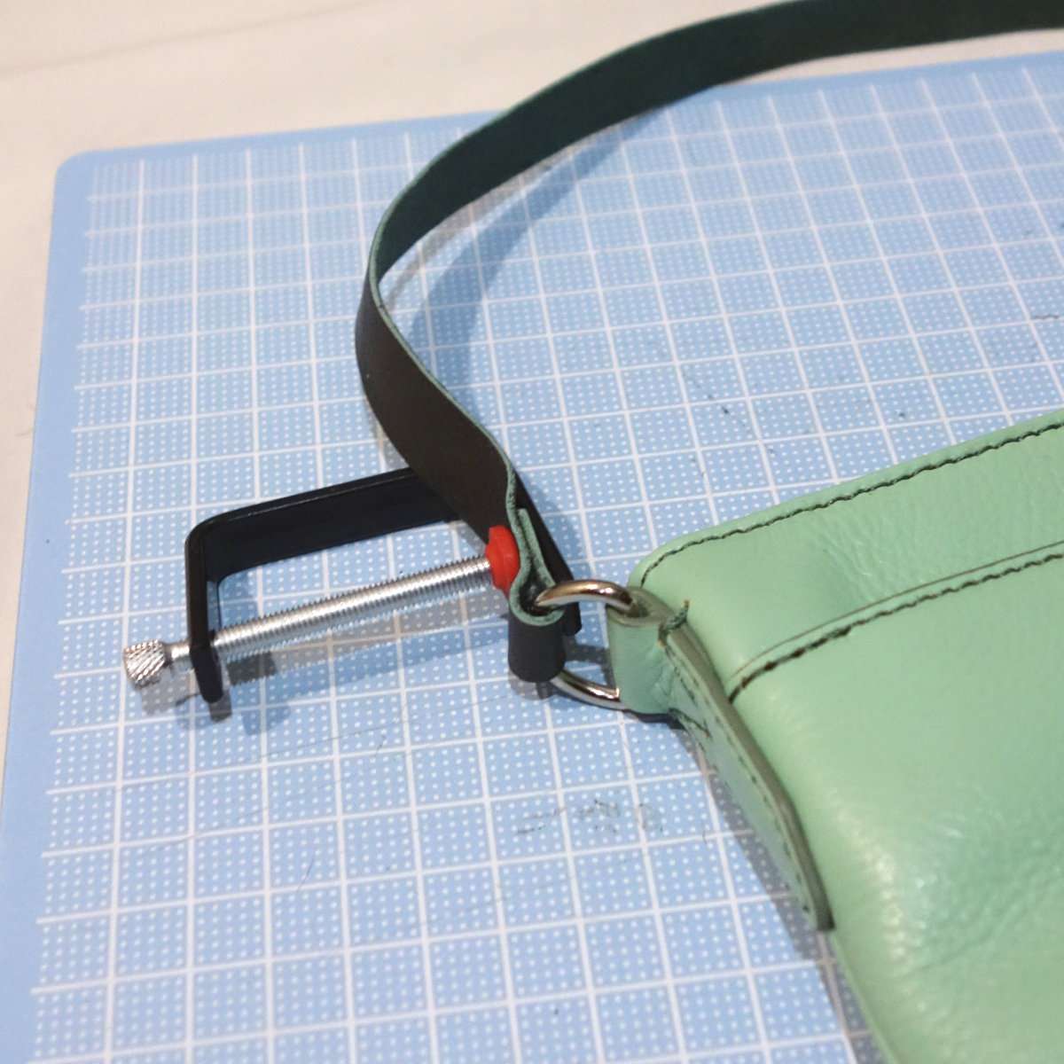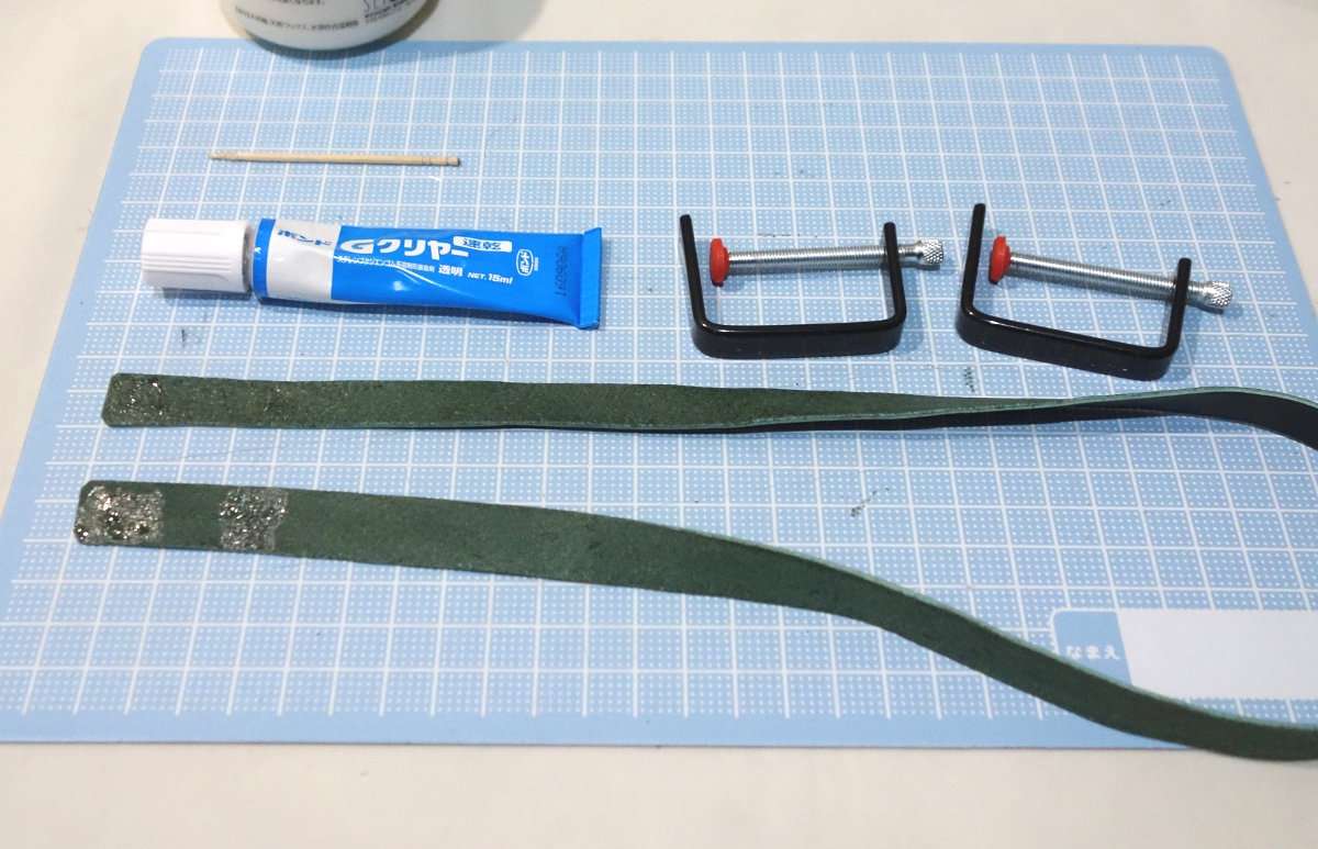 しっかりと接着するために接着部分にクランプをかけます。この時革の切れ端などであて布などをするとクランプの痕が付きづらいです。1時間もすれば接着剤は乾きますが、出来ればしっかり乾かすために24時間はかけたいところです。