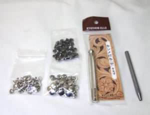 今回は糸で縫わずカシメるのでカシメとカシメ打ち、穴をあけるためのハトメ抜きを用意します。カシメは様々なと種類があるので、革の幅と厚みに合わせてカシメのサイズを選択します。カシメ打ちもハトメ抜きにも選んだカシメに対して適切なサイズがあります。今回は色味的にもシルバーの方が合うのでそちらを使用します。ブラウンの方も良い色ですが、これはまた別のカメラストラップに使用しました。