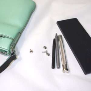 ハトメ抜きを使用して穴をあけます。既に革を接着しているので、ハンドバッグごと移動して穴をあける事になります。