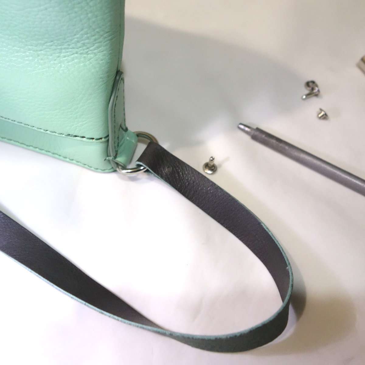 カシメを打って接着面も含めて強度がしっかりしているか確認して完成です。もし接着剤を付けて数時間しか経っていない場合はいきなりハンドバッグを使用せず接着剤が乾くよう計24時間は乾燥させましょう。