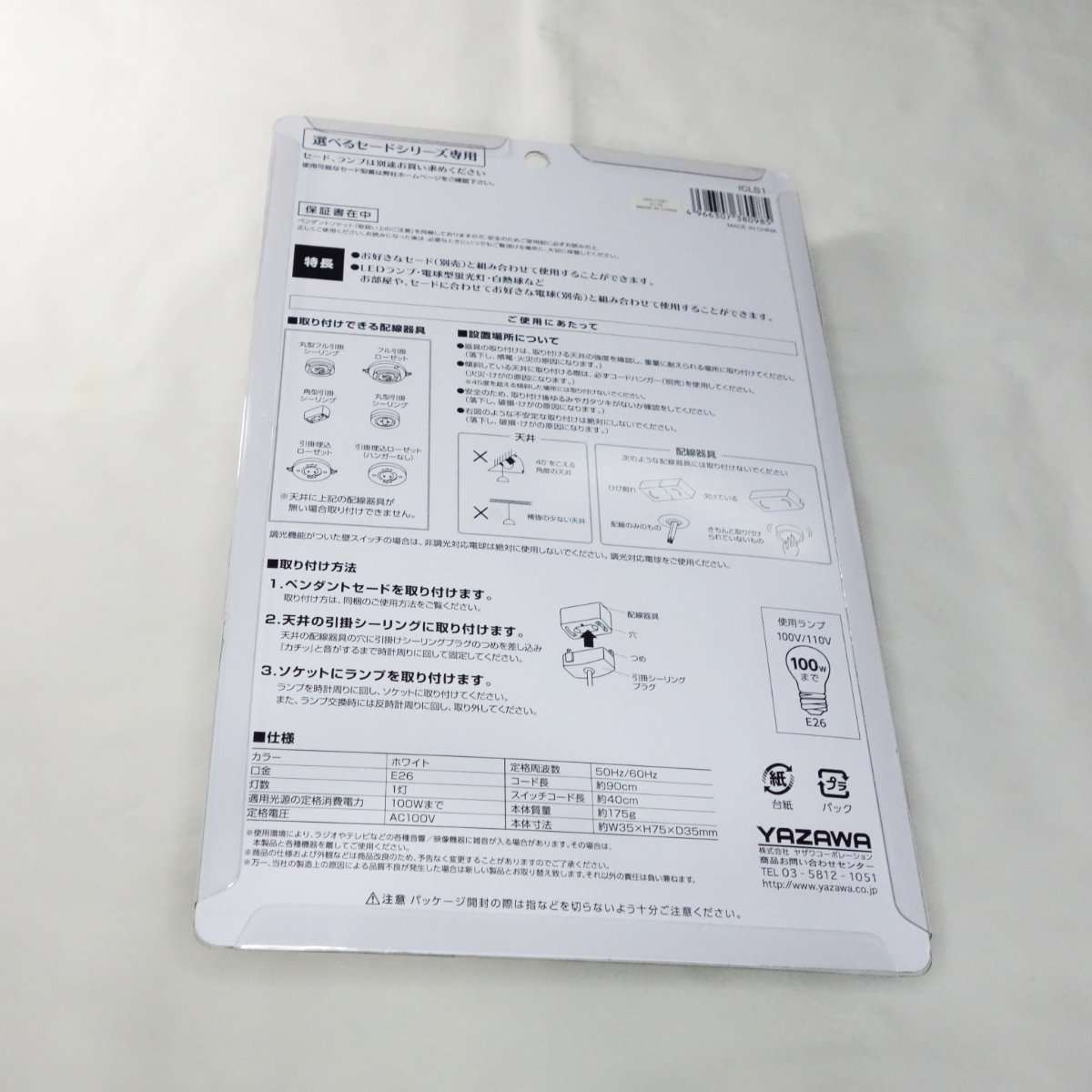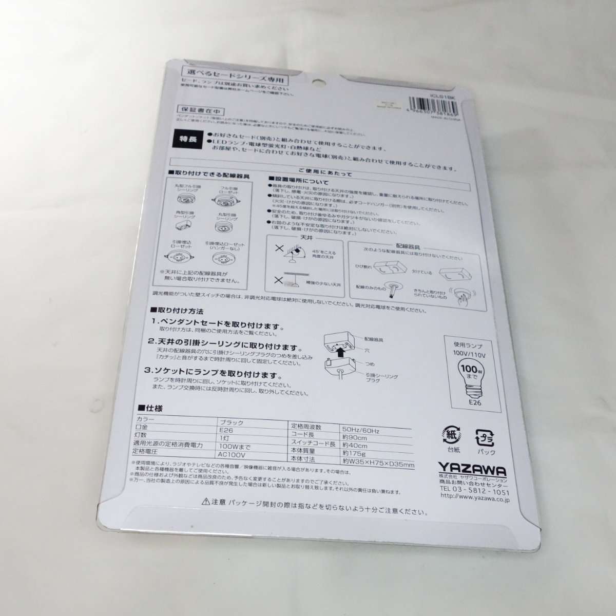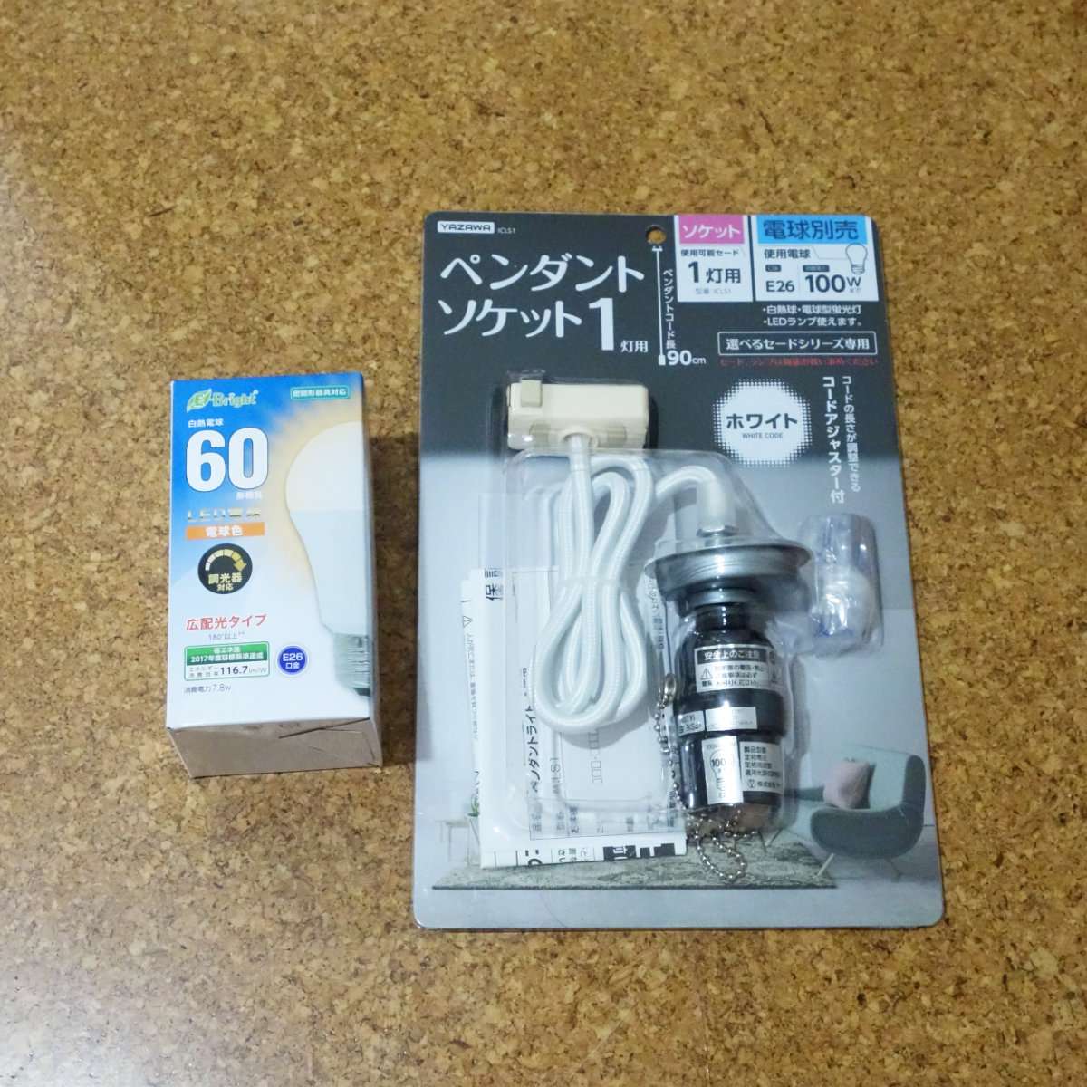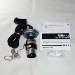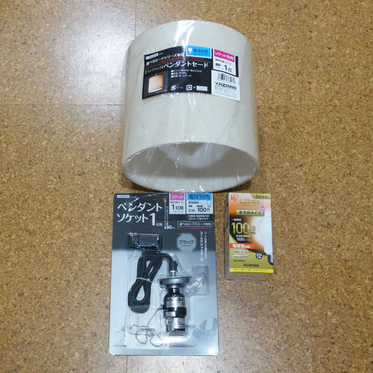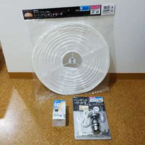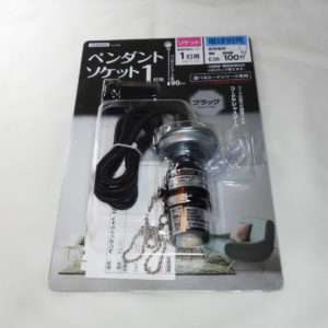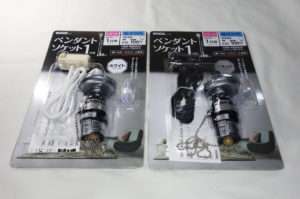 今回用意したのはYAZAWAのペンダントソケットの1灯用でカラーが白と黒の1つずつで型番ICLS1で、ペンダントセード(シェード)は同じYAZAWA製のを2つです。LED電球はE-アイリスオーヤマのLED電球は100形相当の電球色、型番はLDA15L-G/W-10T5と、E-Bright(オーム電機)の60形相当の調光器対応タイプです。電球はどちらもE26金口用で、ペンダントソケットの天井への取り付けは引掛シーリングプラグです。