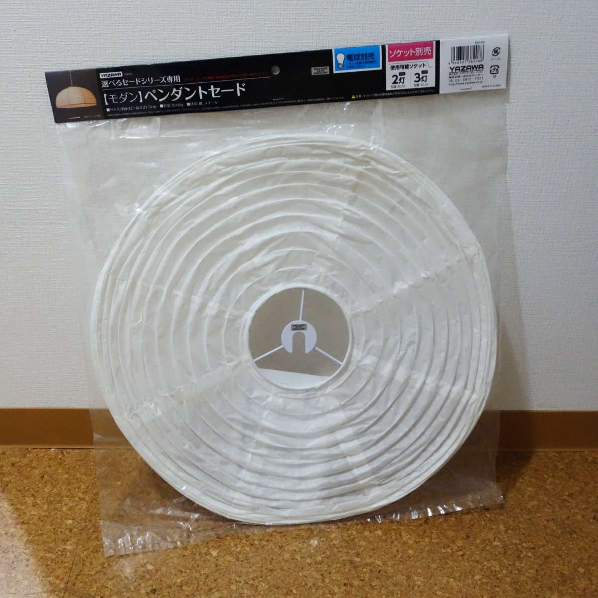 最近レストランなどで紙の変わった形や球状などのシェイドをよく見かけます。こちらは全体を覆うタイプではなく通常の傘の形状で和洋の融合のデザインです。下半分が開いているのでライトがより明るく交換も楽になります。YAZAWAではシェードではなくペンダントセードと記載しています。