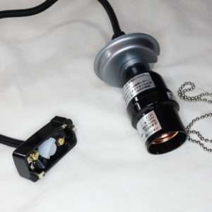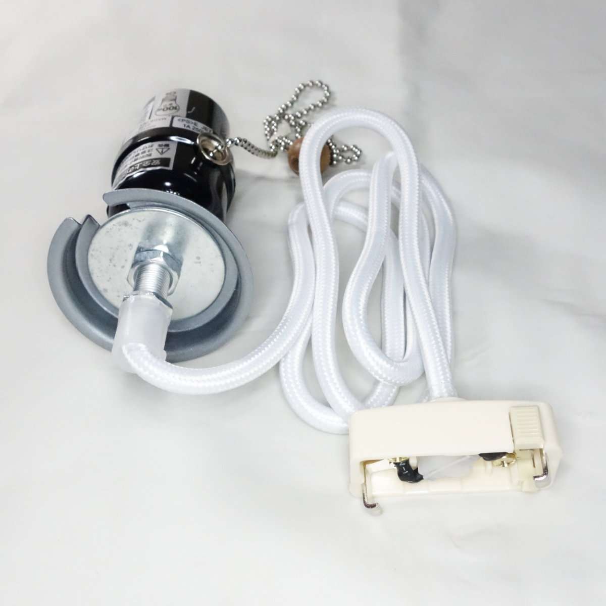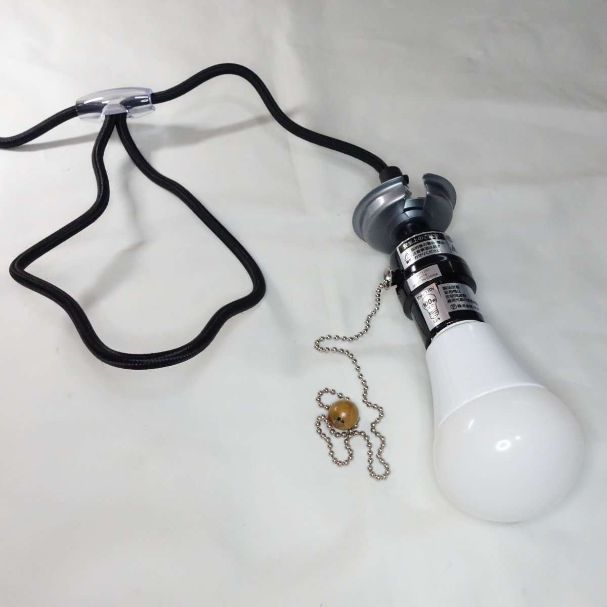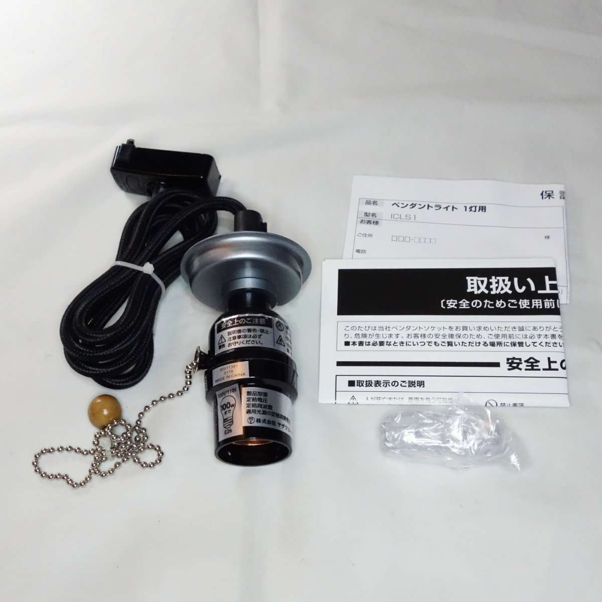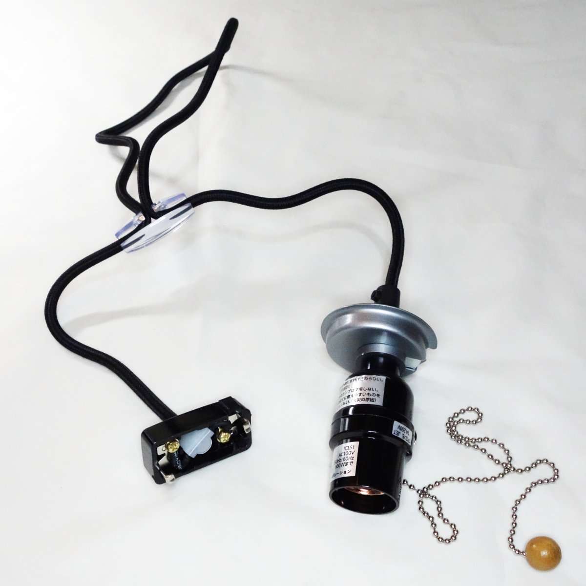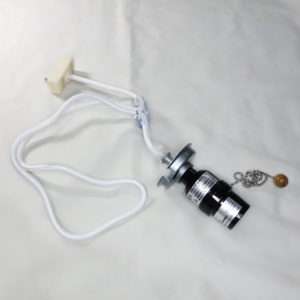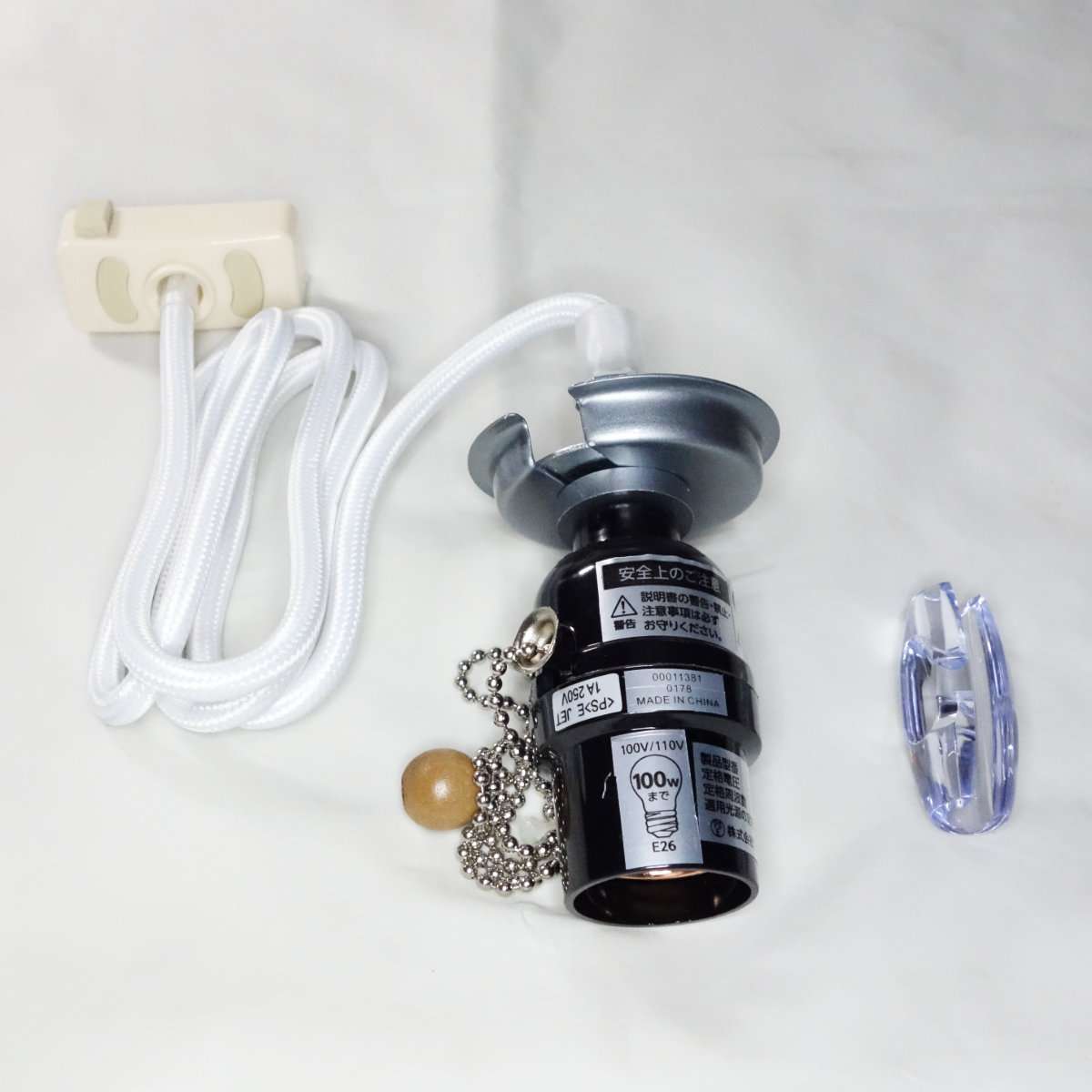 ペンダントソケットは天井に取り付ける引掛シーリングプラグ、コード、電球ソケット、チェーンの電源スイッチで構成されています。透明のパーツはコードを束ねるアジャスター(ホルダー)です。使用の際はコードなどそのままにせずばらしてからにしましょう。