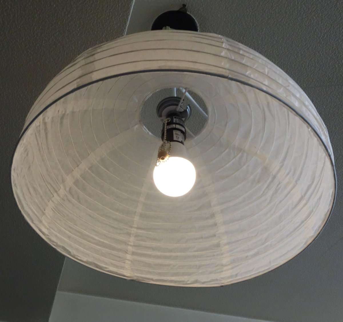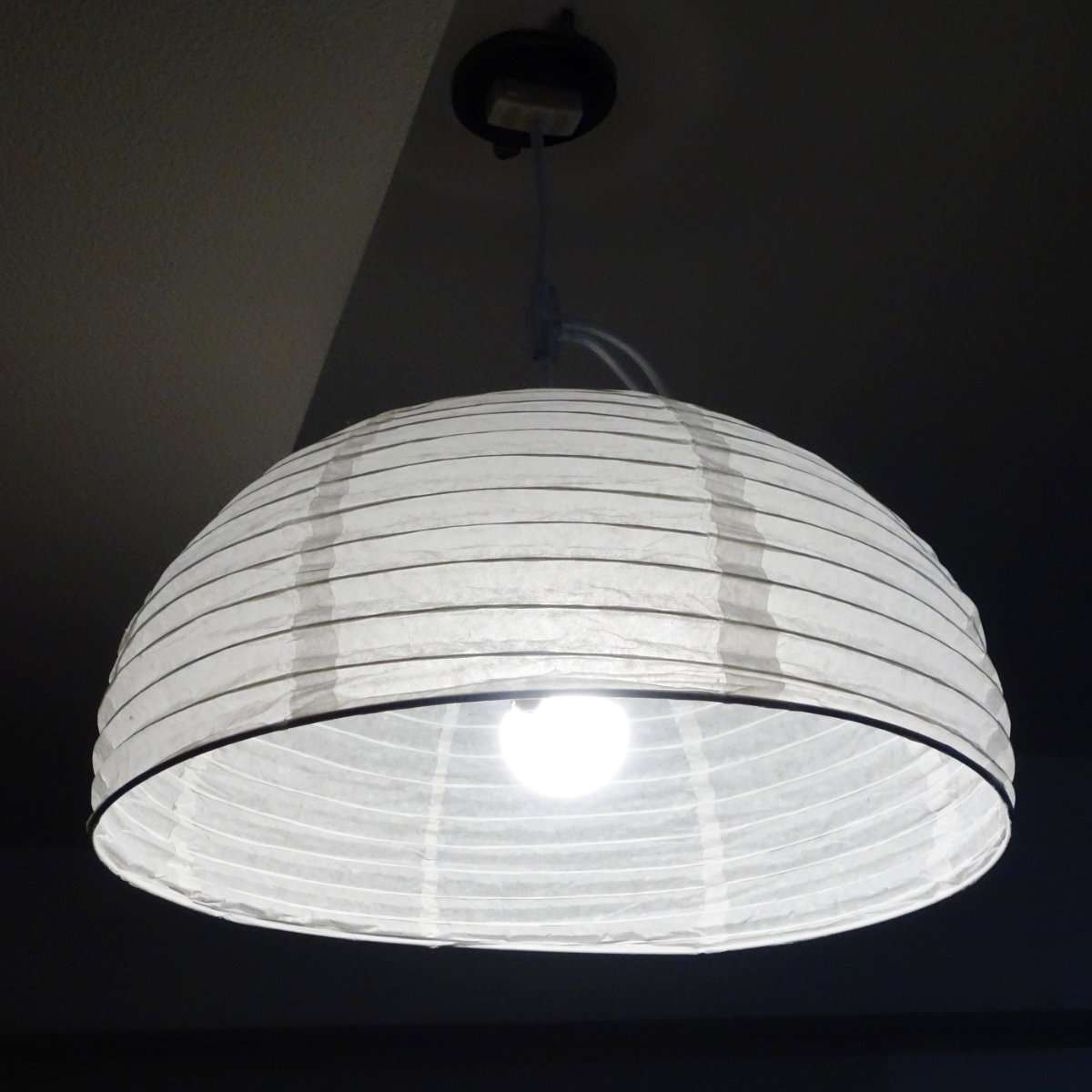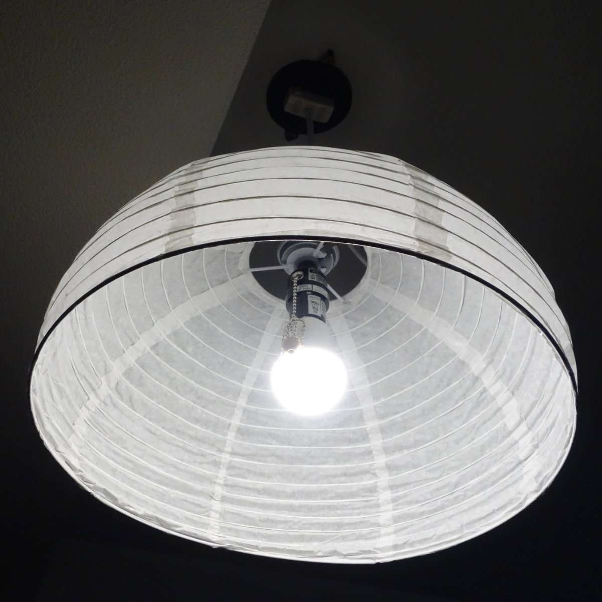 アイリスオーヤマのLED電球をペンダントソケットに接続してシェードに取り付けます。シェード自体の素材が和紙のタイプより分厚いので少し明るめのLED電球を選ぶとよいでしょう。ペンダントソケット部は金具にきちんと固定してシェードが落下しないようにしましょう。