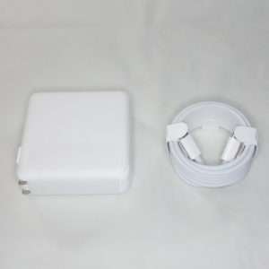 USB-Cケーブルを充電器に接続しますが、USB-C端子の良さである上下どちらでも刺さるので接続はとても楽です。しかもmicor-USBの様なやわな感じはなく、しっかりと刺さり質感が高いです。ちなみにThunderbolt 3ポートなわけだしThunderbolt 3ケーブルとは言わないのだろうかとお思いでしょうが、Appleの公式ページでも充電用のケーブルはUSB-C充電ケーブルの表記しています。