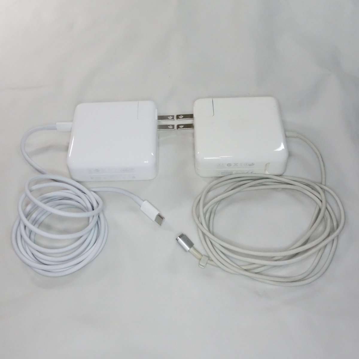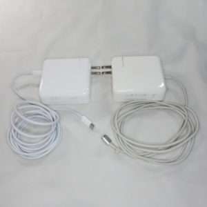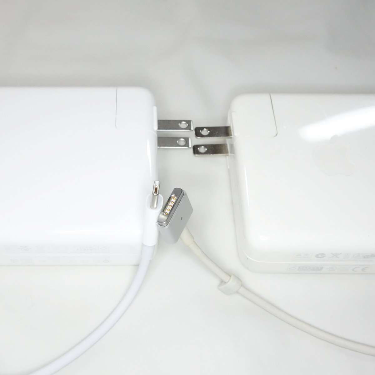 2012 Midの充電器はそれほど汚れていないかと思っていましたが、新品と比べると使い込んで昔のMacの様なベージュに近い色にになっていました。形状はほぼ一緒ですが2012 Mid用はマグセーフ端子で、新型はハイワット対応なUSB-Cなだけにケーブルが太くしっかりしています。