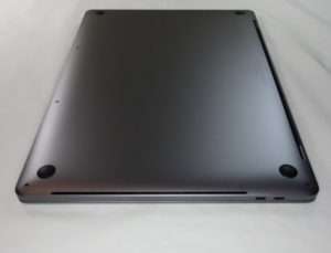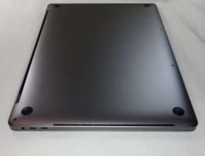 MacBook Pro 2012 MidにはあったUSBポートはThunderbolt 3(USB-C)に変更されていて左右に2つずつ合計4つ付いていて、右側にはイヤホンジャックがあります。どのポートでもUSB-Cケーブル経由で充電が出来るので便利です。PD対応などいろいろと充電器やUSB-Cポート付きのモニターなどが出ていますが、MacBook Proに対応しているか調べてから使用しましょう。特にUSB-Cは規格が乱立していてケーブルも多くあるので出来るだけ純正品を使用するのが確実です。