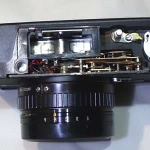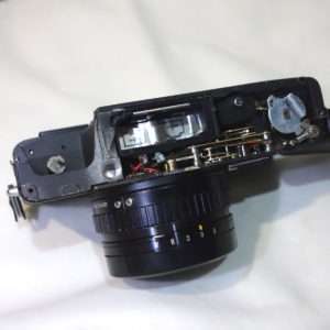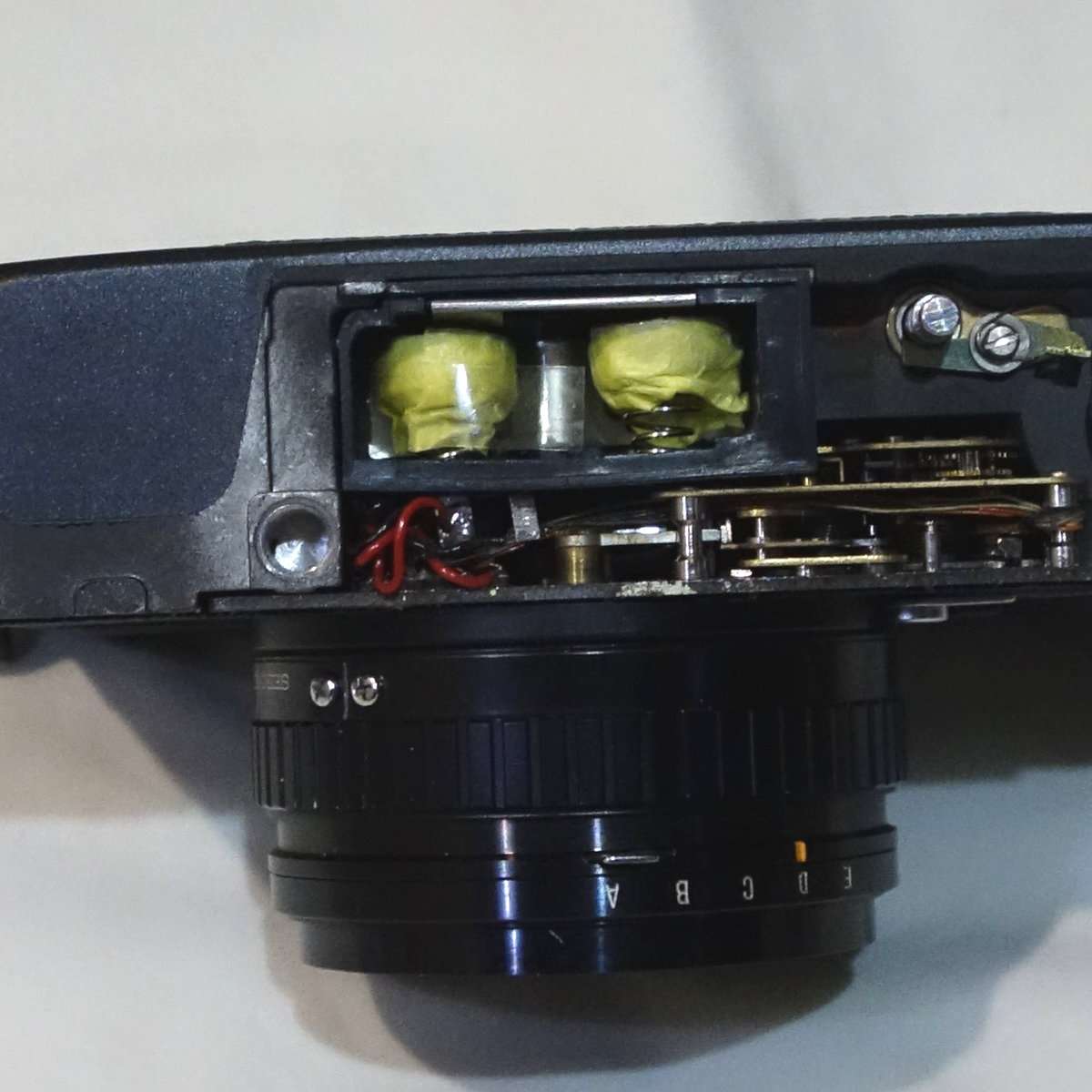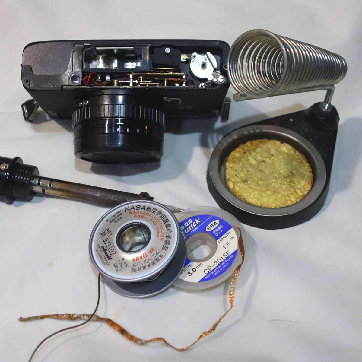 配線修理には当然半田が必要です。ハイマチックEは比較的配線などの空間に余裕もあり、配線も長いので修理はしやすいです。コニカ C35は良いカメラで修理を試すに向いてると言われていますが、実は配線が短くレンズも外すとフォーカス(ピント)調整が必要になり少しメンテナンスしづらいので、ハイマチックEは修理を試すにもよいカメラだと思います。