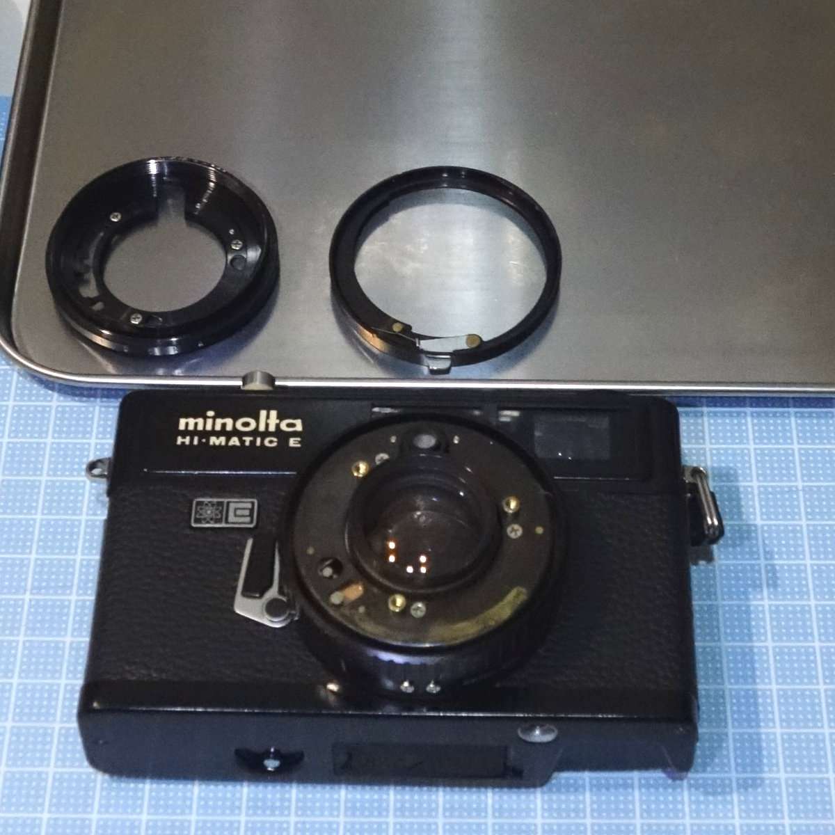 ハイマチックEの前玉までの分解はカニ目レンチとプラスドライバーだけで出来るので、カメラの修理やメンテナンスに挑戦してみたい方に最初の分解用カメラとしてもおすすめできます。ジャンクのハイマチックEは非常に安価ですし、動かずとも分解の練習用にするにもよいと思います。ちなみにレンズボードをはずして後玉をクリーニングするのに半田ごて以外には追加する工具の必要もありません。