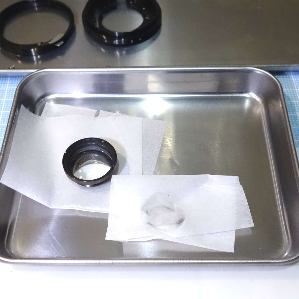 minolta Hi-Matic E(ハイマチックE)のレンズユニットはシャッターの前と後ろに1つずつついていますが、今回は前玉と言われる前面のレンズを綺麗にします。元々カビはなく状態はそれほどひどくないですが、ホコリが見られるのでそれを中心に綺麗にしていきます。