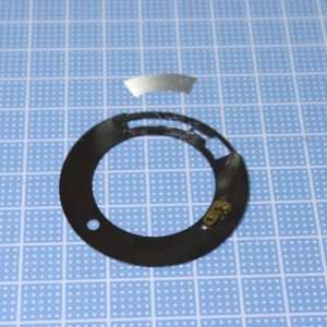 minolta Hi-Matic E(ハイマチックE)は1971年発売ですので、調子がよく動いていたとしてもどれも40年以上経つ相当古い物となります。ネジで付いているようなメカニカルなパーツは実際脱落したりする事はほとんどありませんが、古いクラシックカメラなどでパーツ脱落の1番の原因は接着剤の劣化だったりします。このISO/ASA設定リングの測光用の穴が開いたプレートも接着剤で貼り付けてあるため接着剤が劣化するとレンズ沈胴内で脱落してしまいます。