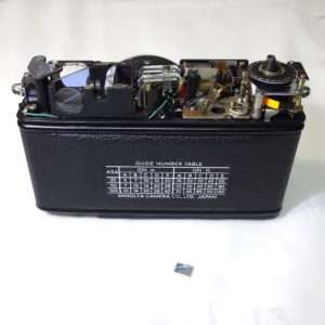 ミノルタのカメラに限らずこの頃のカメラはスペースを確保するためにネジではなく多くのパーツが接着剤によって取り付けてあります。さすがに発売後に40年以上経ってるカメラですので、接着剤が完全に劣化してパーツが脱落してくる事がよくあります。今回は小さなミラーが落ちてきました。これはファインダー表示用の反射ミラーですが、取り付けは簡単です。