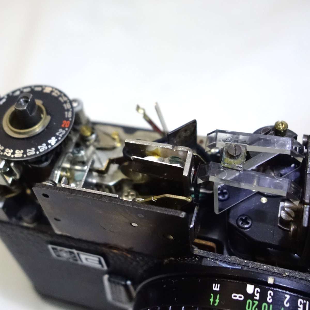 レンズボードをおろすとフォーカス(ピント)がずれファインダーの二重像の調整が必要になりますので、ついでに清掃もしてしまうためにファインダーのカバーもはずしました。これは修理をして最後で構いません。