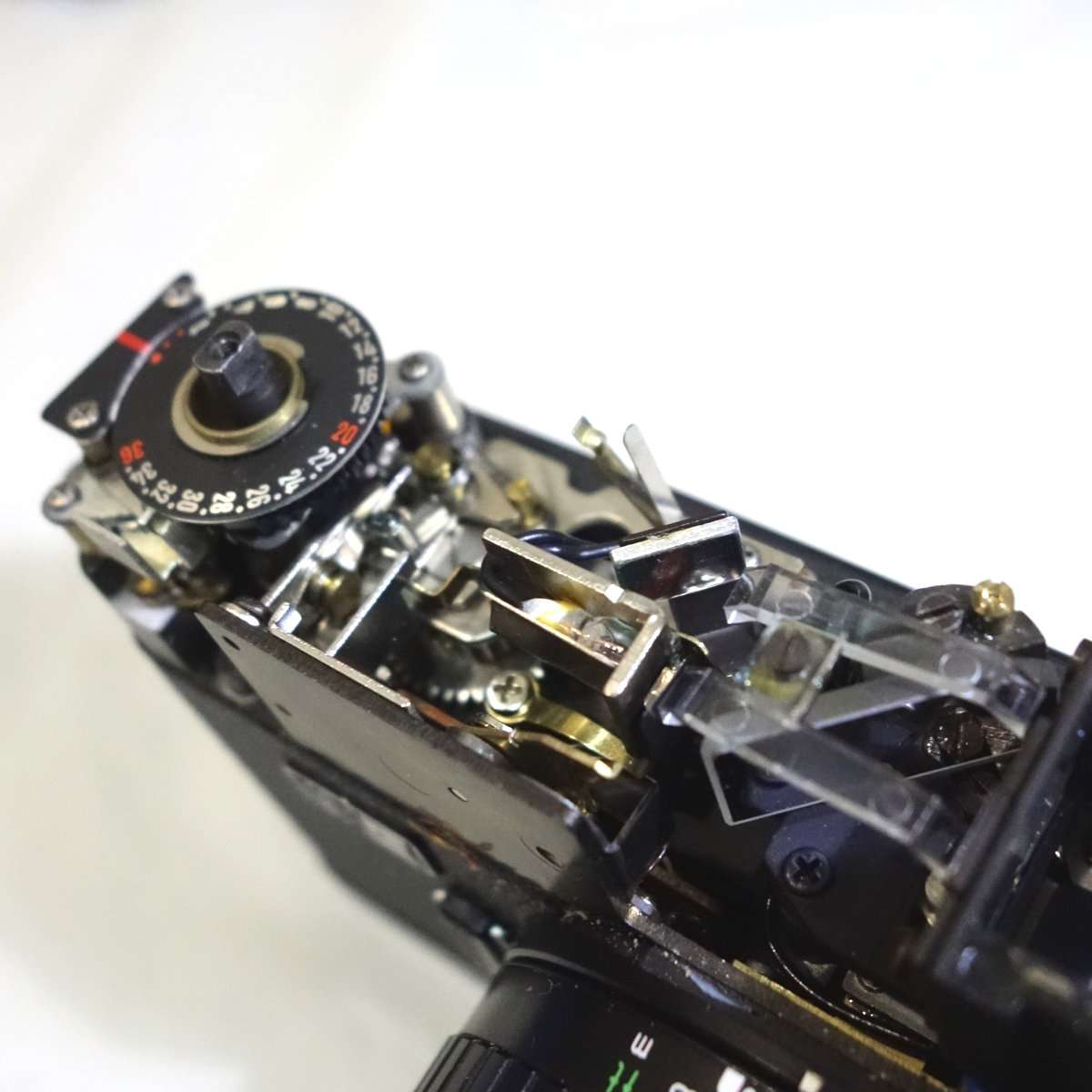 次はセルフタイマーのレバーをはずします。セルフタイマーレバーの付け根に黒いパーツがありそれは接着されてるだけなのではがします。はがすとプラスネジが出てくるのでレバーをはずします。ワッシャーと共にパーツをなくさないようにしましょう。
