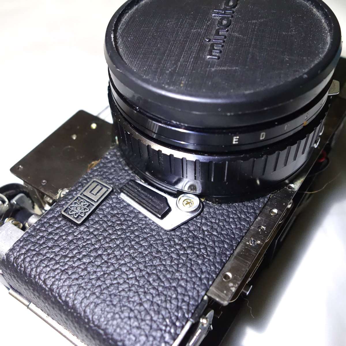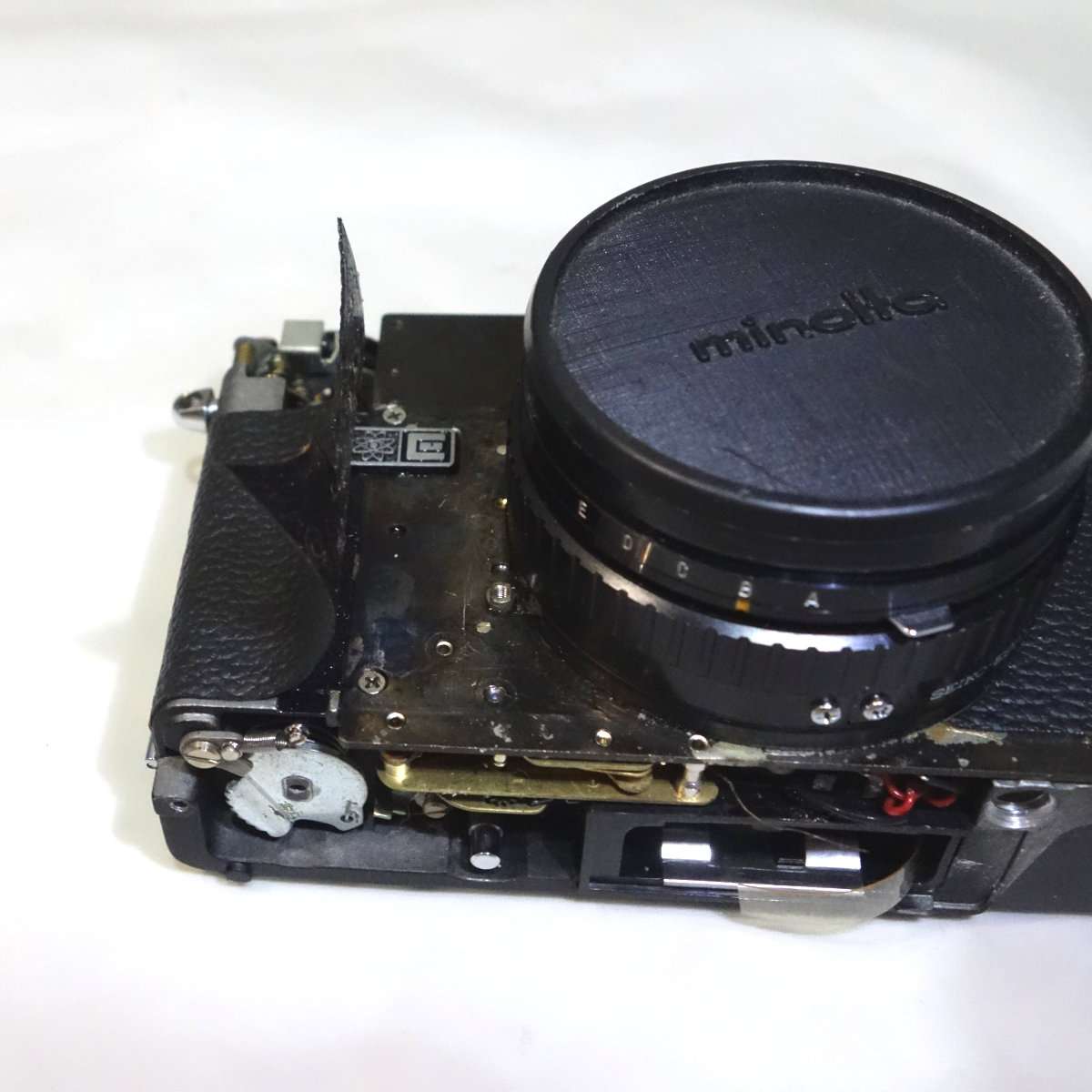 ミノルタのカメラに限らずこの頃のカメラはスペースを確保するためにネジではなく多くのパーツが接着剤によって取り付けてあります。さすがに発売後に40年以上経ってるカメラですので、接着剤が完全に劣化してパーツが脱落してくる事がよくあります。今回は小さなミラーが落ちてきました。これはファインダー表示用の反射ミラーですが、取り付けは簡単です。