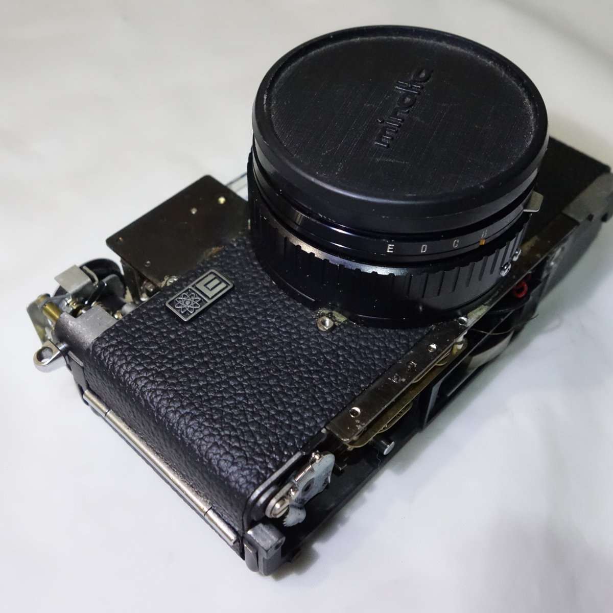 配線部分にアクセスするためにはレンズボードをおろす必要があります。レンズボードをおろすにはトップカバー、底カバー、セルフタイマーのレバーをはずし、レザーをはがす必要があります。トップカバーの詳しいはずし方はハイマチックEシルバーのレンズボードをおろした時の記事に詳しく書いてあります。はずす前にレンズに傷がつかないようにレンズキャップを取り付けましょう。