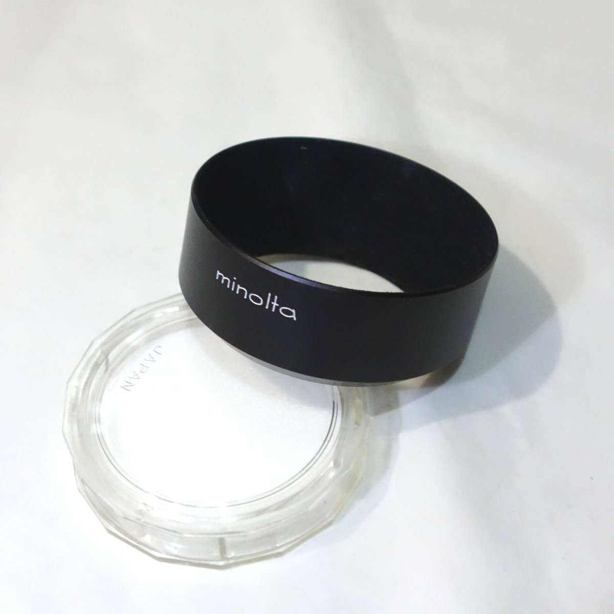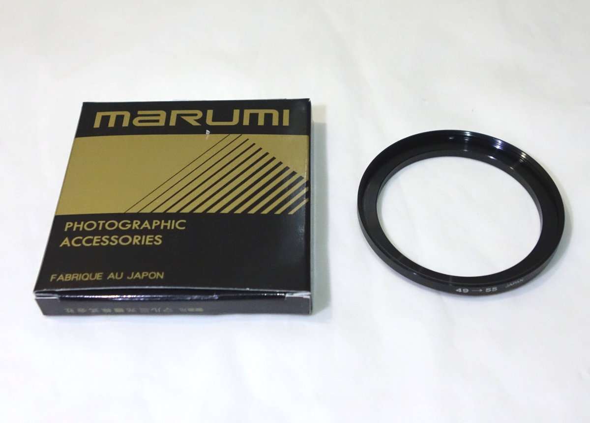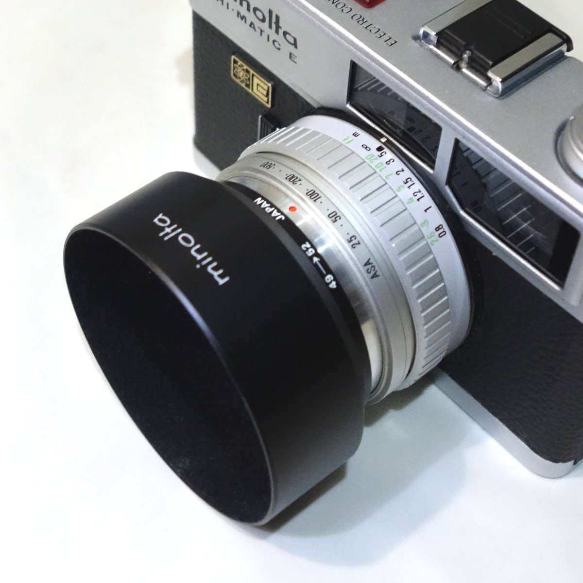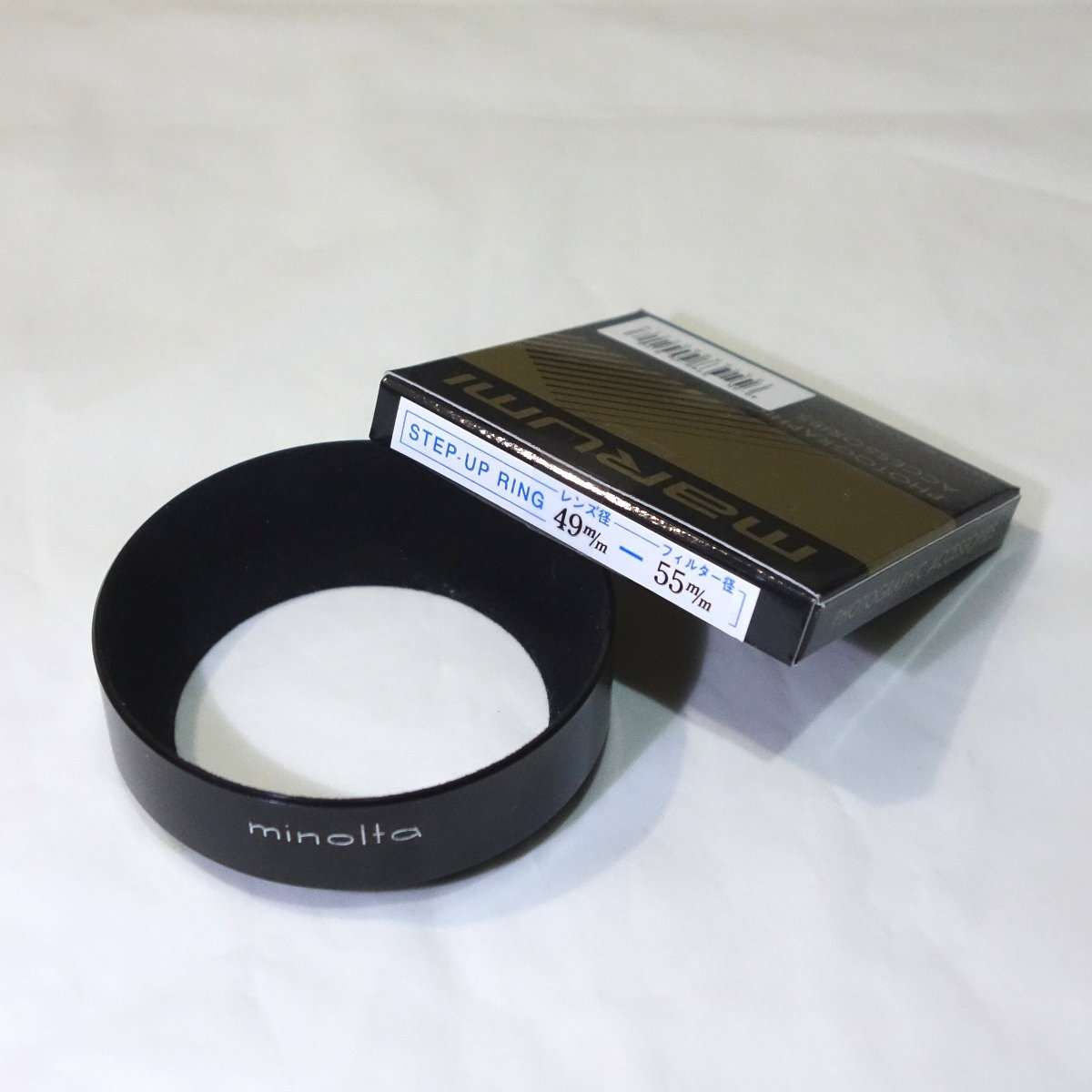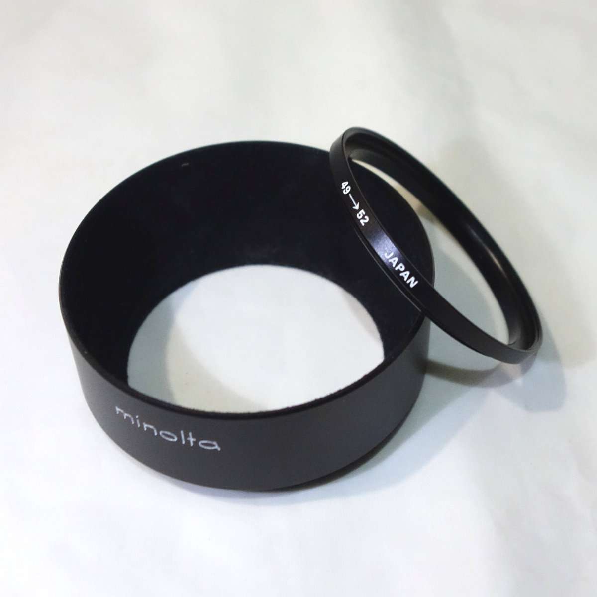 取り付け径が55mmとなるので、49mmを55mmに変換するステップアップリングを用意します。画角が50mmで取り付け径も大きいのでハイマチックEに使用しても写真に映り込む事はありません。比較的新しいからか長さも短めでデザインもよくミノルタ純正のメタルフードの中では1番気に入っています。この後別途MC Rokkor 50mm F1.4も手に入れました。