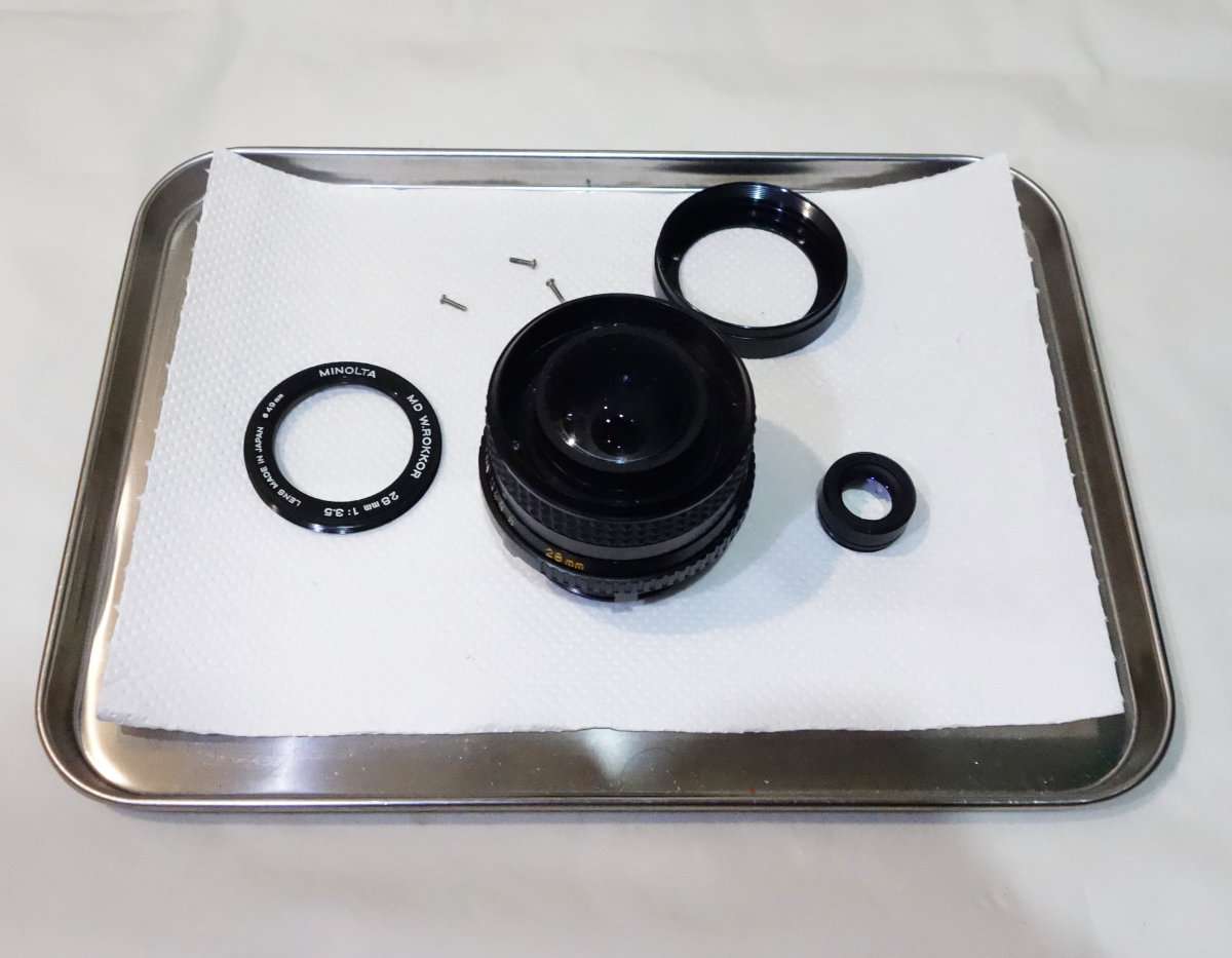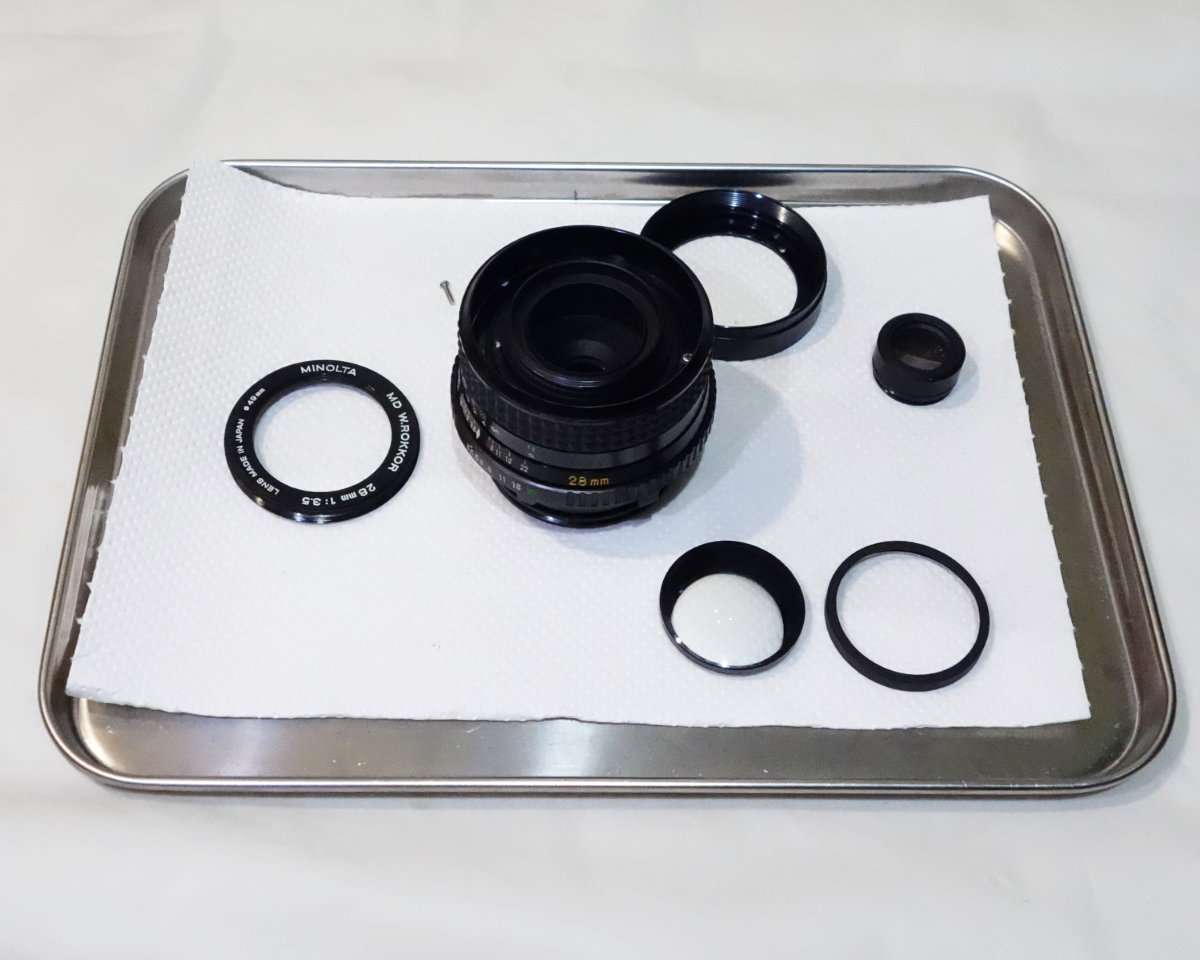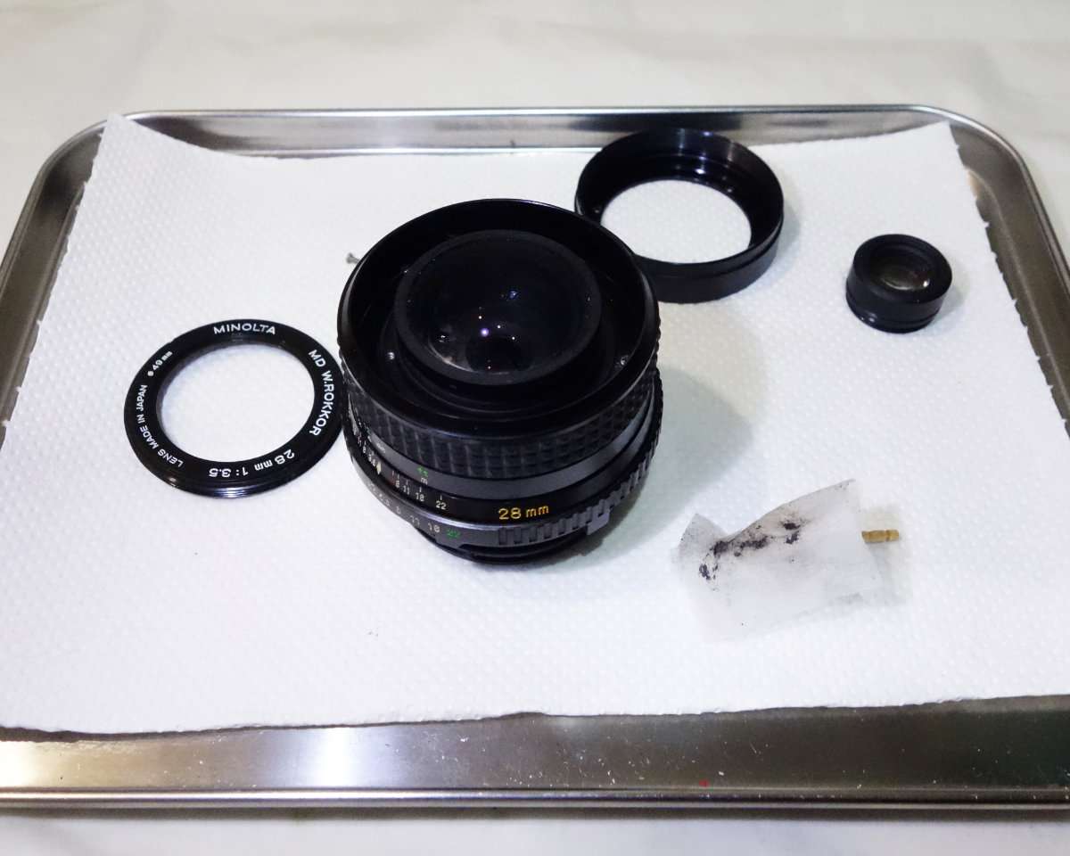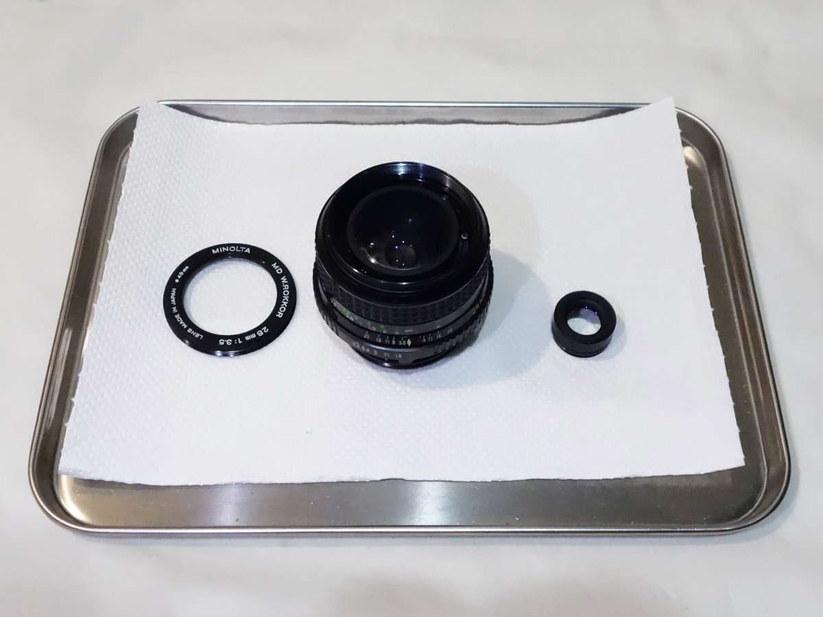 ミノルタSR-T101と同時に手に入れたMD Rokkor 28mm F3.5はそのまま撮影に使えるものの少しカビがある状態です。せっかくSR-T101を修理して完動品にしたのもあり、レンズの方も綺麗にする事にしました。