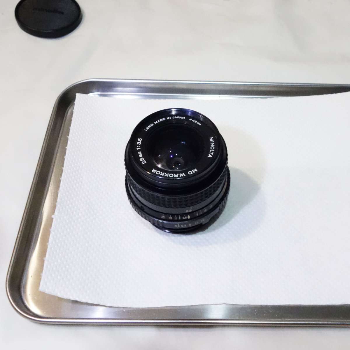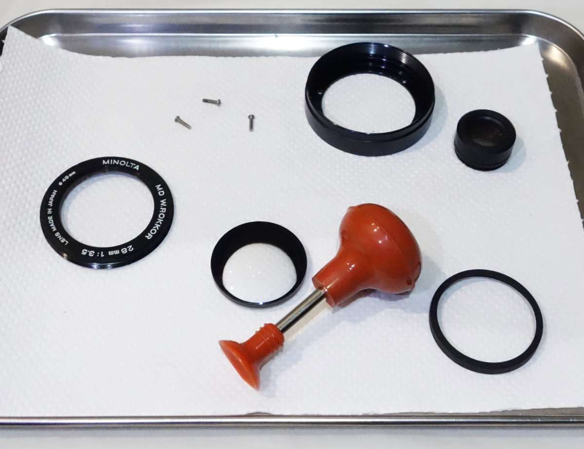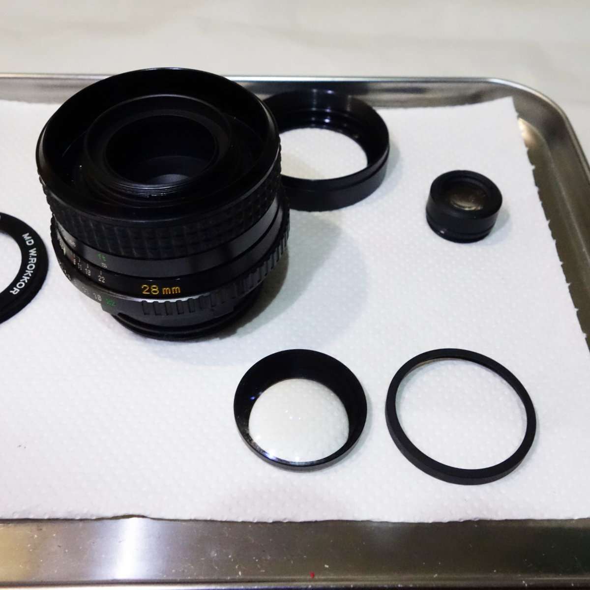 ミノルタSR-T101と同時に手に入れたMD Rokkor 28mm F3.5はそのまま撮影に使えるものの少しカビがある状態です。せっかくSR-T101を修理して完動品にしたのもあり、レンズの方も綺麗にする事にしました。